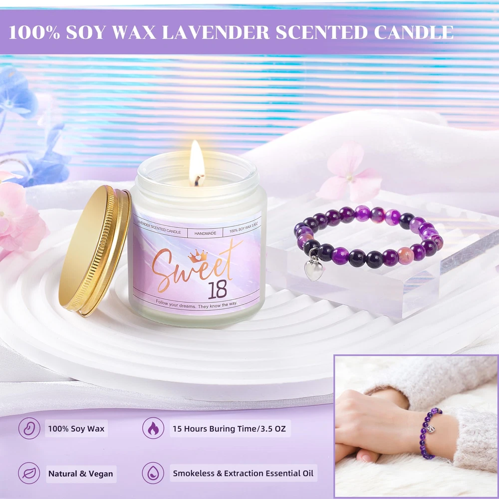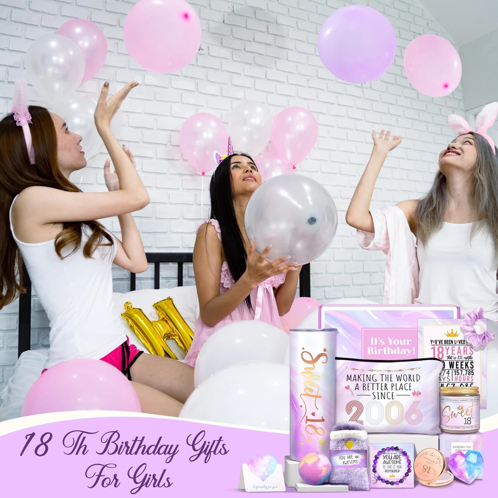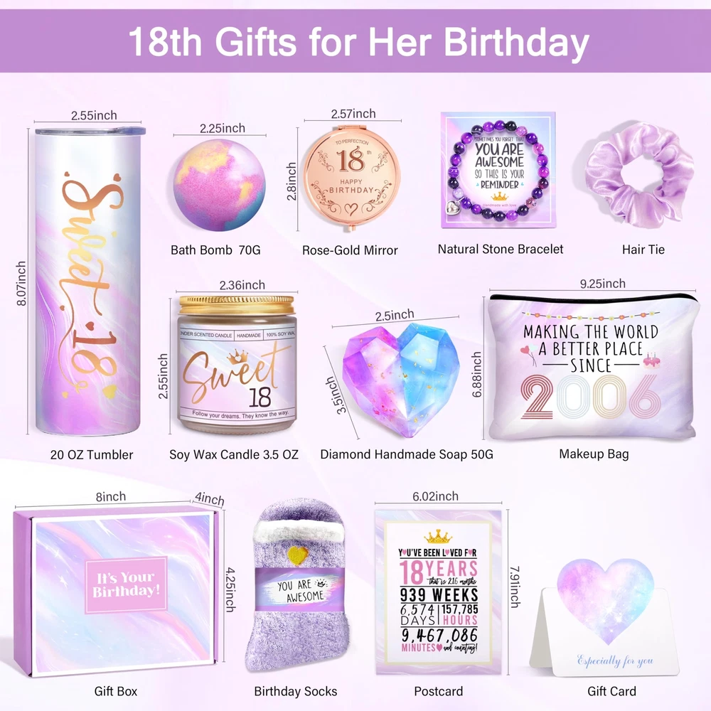 18 YEAR OLD GIRL BIRTHDAY GIFTS: Our gift boxes are beautifully designed and each gift is carefully arranged like a precious treasure waiting to be discovered. All these 18th birthday gifts for girls are well-designed, gifts for girls, girlfriends, sisters, daughters, nieces, sisters, friends, daughters 18th birthday gifts, let people open the moment, feel full of surprise and warmth GIFTS FOR 18 YEAR OLD GIRL CONTAINS : 12 Beautifully Packaged Gifts 1 x 20 oz stainless steel tumbler, 1 x scent candle, 1 x cosmetic bag, 1 x happy birthday 18 Makeup Mirror, 1 x natural stone bracelet, 1 x soft fuzzy socks, 1x bath bomb, 1 x diamond handmade soap, 1 x Hair Tie, 1 x birthday card, 1 x Postcard, 1 x Happy Birthday Gift Box. Receiving this gift box set, she will feel extremely happy and cherished, as if she has an exclusive luck and blessing PREMIUM QUALITY INSULATED VACUUM TUMBLER : “Sweet 18”20 oz cup, made of 18/8 food-rugged stainless steel, can keep drinks warm for 6 + hours, cool for 9 + hours, with this cup of iced juice or warm coffee, you can add a cozy life. Receiving such a practical and beautiful cup as a gift will make people feel incredibly intimate and warm, and a good day begins with your birthday gift BIRTHDAY GIFTS FOR TEENAGERS READY FOR YOU:Our gifts come beautifully gift boxed, no need to re-wrap, and don't forget to leave a personalized gift message by choosing to do so. Create a special birthday for a girl! We want the person you care about to receive the perfect gift, no matter you have any questions, please us, our after-sales team will give you the greatest support