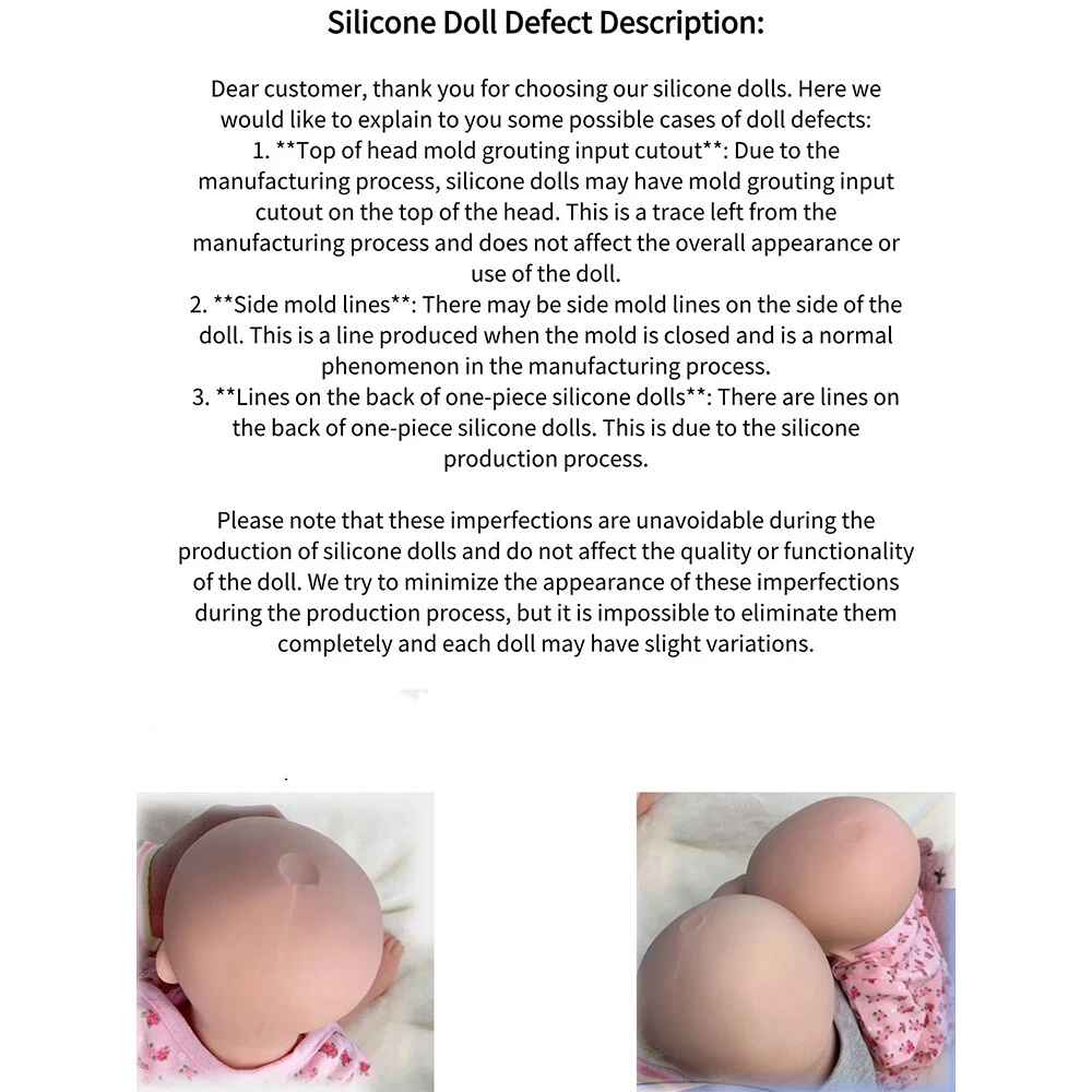 • Size: Around 19Inches from head to toe, . It fits into newborn size hat, diapers, and other baby accessories • Material: made of authentic silicone. We use only the best reborn supplies,making your reborn very realistic. • Mouth: Closed mouth ,he can't take a pacifier • Function: Doll's limbs are flexible and poseable, the doll can sit, lay down easily and have a bath, but cannot stand up, speak, pee, blink • Safety: Conforms to the safety requirements of ASTM F963 and EN71 for ages 3+ • Application: Birthday present, christmas gift, children playmates, grandparent's companion, and doll collection • Recommended Age Range: 3 years old+ PACKAGE INCLUDES : • 1 x painted Silicone Reborn boy doll ( anatomically correct) • 1 x birth certificate • 1 x dipper 【Kind Reminder】Each of our dolls is purely handmade, and the pictures are real-life photos. There may be slight differences between each silicone doll, and there may be slight flaws. If you mind, please choose carefully. 【User Notice】 Our reborn baby dolls' head has a silicone injection hole. The injection hole is one of the processes of making dolls. So it will leave a slight mark on its head. This is not a doll's quality problem. Tips: Silicone doll daily care can be done by patting talcum powder all over the body after cleaning the doll, keeping it dry and avoiding sticking.