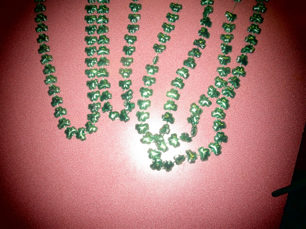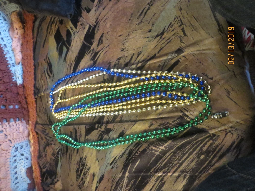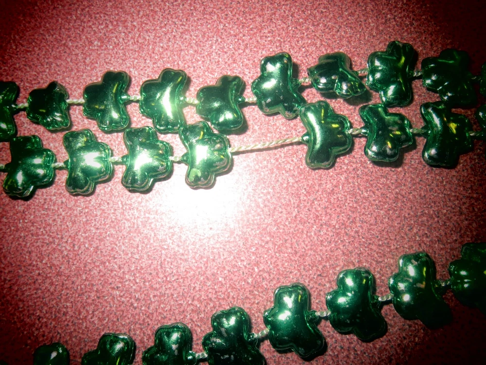19 MARDI GRAS BEADS NECKLACES MOTORCYCLE BIKE RALLY THROW BEAD BIRTHDAY PARTY. The gray beads pictured last are not Mardi GRAS but is a long vintage necklace included just for fun. Also please note that 5 of the beads are in shape of shamrocks great for St. Patrick's Day!