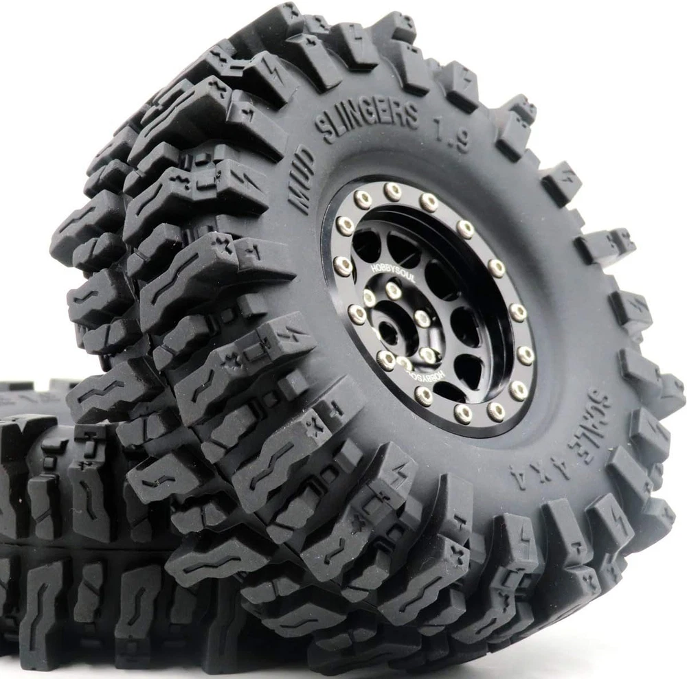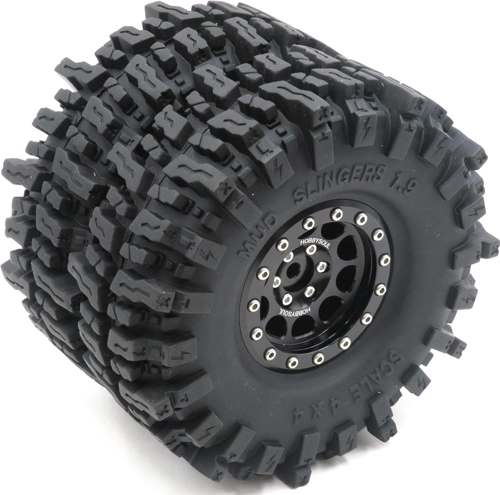 Made in the HOBBYSOUL Soft Sticky Compound tire with aluminum Wheel ( These tires better than common rubber that is good heat resistance and good cold resistance, high wear resistance and excellent durability. Sticky Soft compound delivers maximum gripping power for loose conditions - dry and loamy, or wet and muddy and rock Crawling, Design for professional RC crawler. ) 4pcs 1.9 Mud Slingers Tires + 4pcs 1.9 Aluminum Beadlock Wheels (Pre Assembled) Fit for Traxxas TRX4 / RC4WD D90 D110 TF2 / Tamiay CC01 / Axial SCX10 90047 SCX10 III AXI03007 / Redcat Gen8...... Tire diameter: about 120mm (4.72inch) / Tire Width: About 43mm (1.69inch) / Wheel hex: 12mm Total Weight: about 180g/pc (1pc beadlock wheel + 1pc tire with foam) If just need 1.9 mud slingers tires, please purchase the 4pcs tires ASIN: B08B42PVV9 or 5pcs tires ASIN: B08LGWLSQJ . Product Description TIRE HEIGHT & WIDTH Tires Height: 4.72'' (120mm) is perfect for scale crawlers that want maximum ground clearance and unmatched rock crawling performance, giving you the height you need to tackle any obstacles and give you the optimum in handling;Tires Width: 1.69'' (43mm) is super grip and suitable for a variety of terrains TIRE TREAD PATTERN These RC 1.9 tires have larger tread delivers maximum gripping power for loose conditions ( fit for dry / loamy / wet / muddy / Rock crawling / Swampers / Badland Terrain), the SOFT COMPOUND and LARGER LUGS, DEEPER VOIDS TREADS and SIDE CLEATS enhanced the performance in mud and rock crawling. TIRE MATERIAL HOBBYSOUL Soft Compound Tire (with foam insert), good heat resistance and good cold resistance, give you the optimum in handling, durability and longevity. WHEEL Aluminum 1.9 Beadlock wheel consists of 5 parts, easy to remove and change the tires; Aluminum anodic oxidation sleek surface, longevity and beautiful appearance. MULTI-TERRAIN