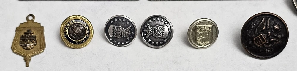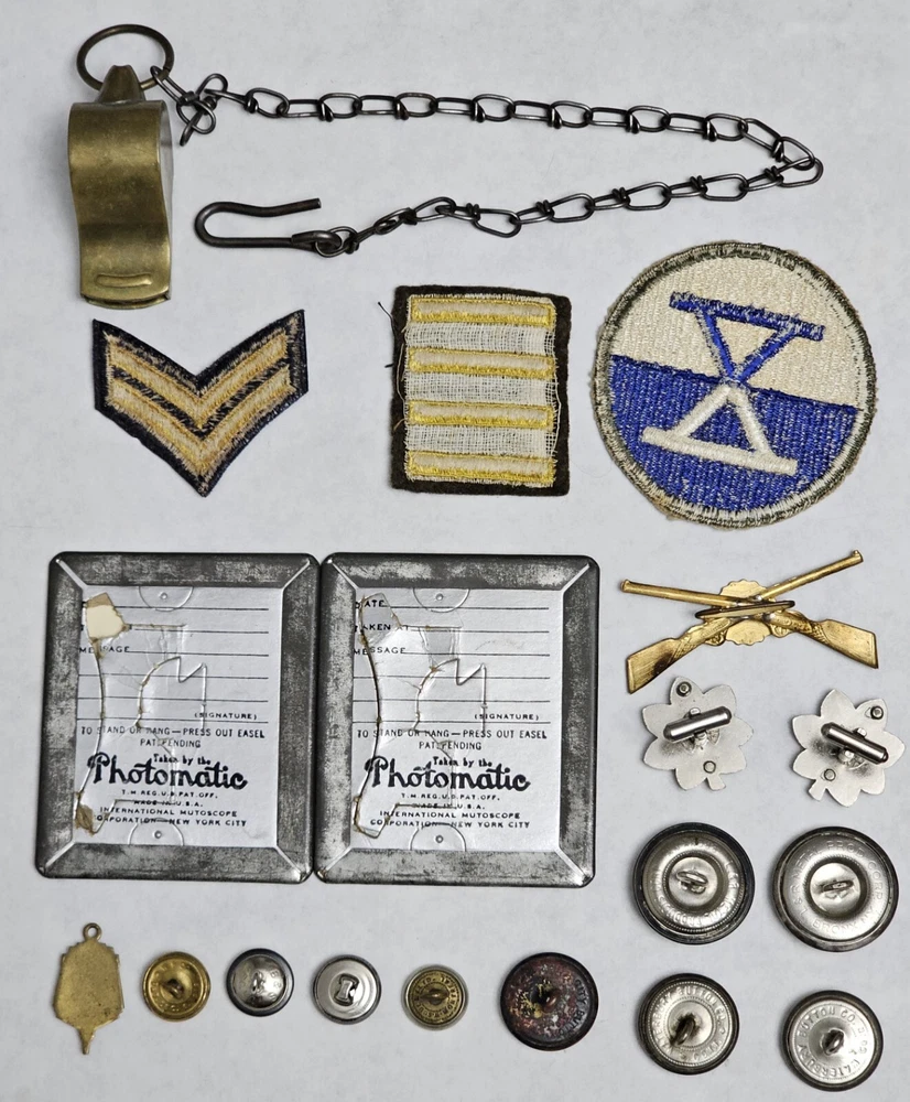 Up for auction is an original lot of 19 WWII and other wars. Buttons, photos, whistle, patches, cufflinks, charm, Navy, artillery, etc. What you see in the photos is what you are getting. Ask any questions. *See other auctions of military items. Lots, dog tags, unique items, sterling pins, etc. This lot came from a private collection. See all the photos and ask any questions. I will combine shipping on multiple wins. I ship to the lower 48 U.S. States only! NO INTERNATIONAL SHIPPING!