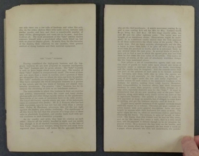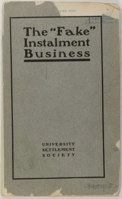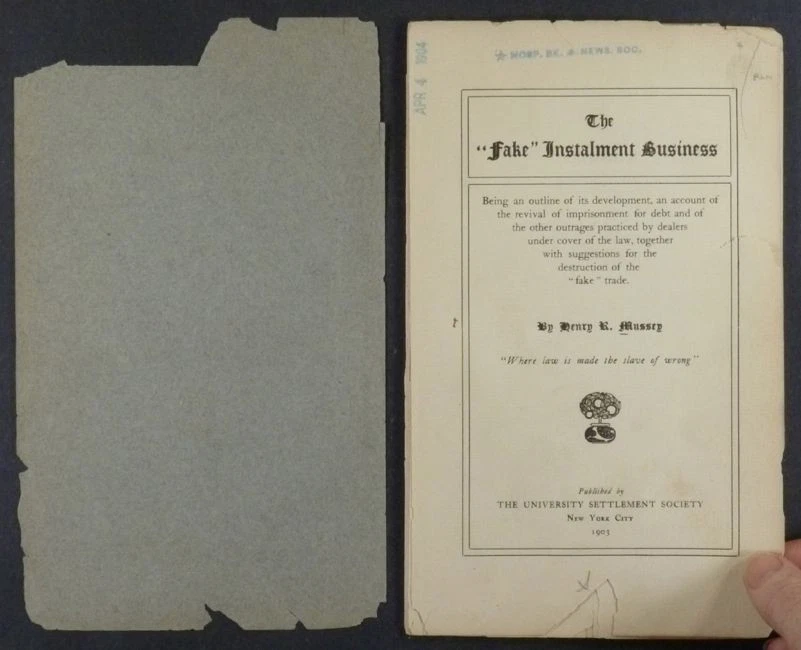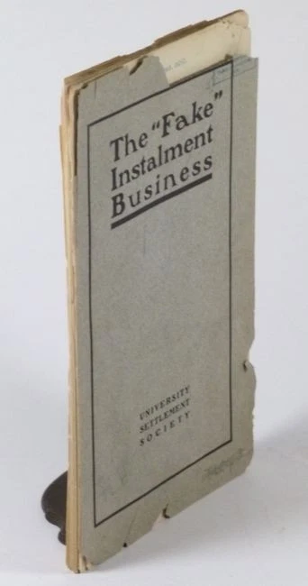 “The "Fake" Installment Business” By Henry R. Mussey. Published in New York by The University Settlement Society in 1903. DISCUSSION: "Being an outline of its development, an account of the revival of imprisonment for debt and of the other outrages practiced by dealers under cover of the law, together with suggestions for the destruction of the 'fake' trade". A study of the so-called "fake" trade -a trade which, according to the author, flourished exclusively in New York's East Side Italian immigrant community. Poor immigrants were sold "gewgaws" and jewelry at "outrageously inflated" prices, often 10 to 20 times what the objects were worth, and signed a draconian contract for installment payments. The corrupt dealer then arranged for them to miss a payment and would immediately demand full payment of the balance. If the immigrant could not borrow enough from friends to pay, a corrupt policeman would arrest him, at which point he would either pay up or be sent to what amounted to debtors prison until his friends and family finally settled the bill. The author also includes proposed legislation to correct this scam. This study was reprinted in 1936, and neither printing is common, although the text can now be found online. Softcover. 5.5"x9", 45 [1] pages. A poor copy, ex-institutional, completely disbound with the pages and front cover all loose, and rear cover missing. In addition the paper is very brittle and the pages and cover are chipping. For all this, a very scarce item in any condition. SHIPPING NOTES: We combine shipping charges on orders for more than one item- you pay the shipping fee for your first item, and any other items that you order at the same time are shipped with it for no additional charge [If you buy more than one item please ask us to send a revised invoice before you pay]. All ephemera & photos are shipped USPS ‘Ground Advantage’ (which used to be First Class Package) in a board-reinforced card mailer with a large red DO NOT BEND sticker. Stock #36221 Joslin Hall Books & Ephemera Selling books & ephemera since 1983 - Member of the Antiquarian Booksellers Association of America the International League of Antiquarian Booksellers and the Ephemera Society . Your satisfaction is guaranteed with every item you purchase.