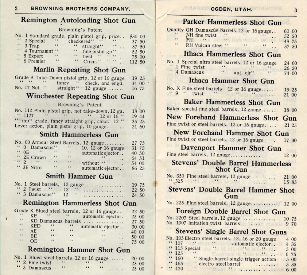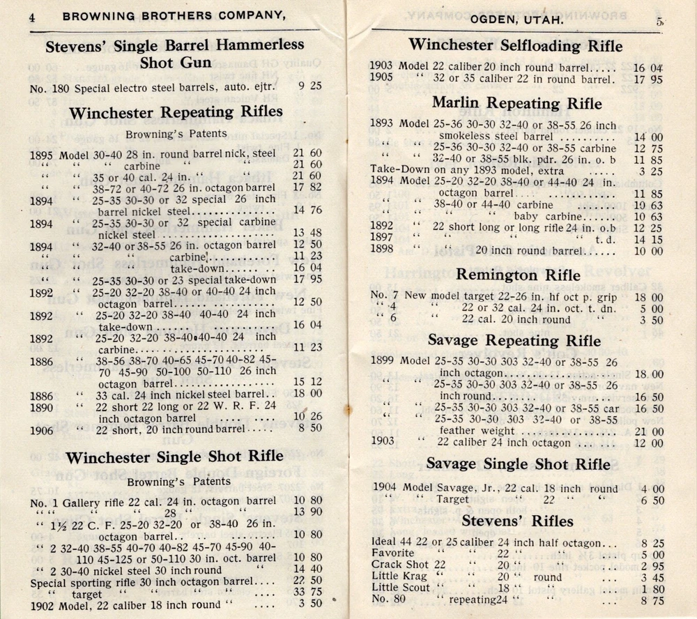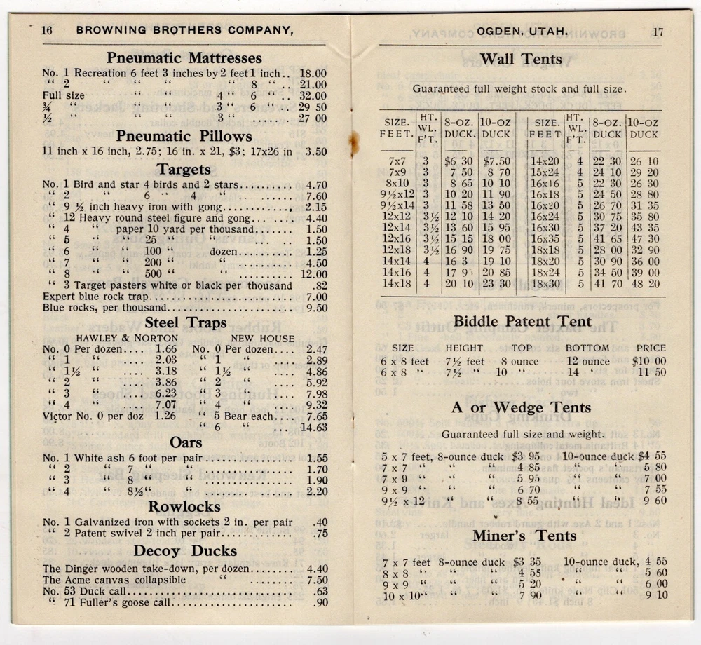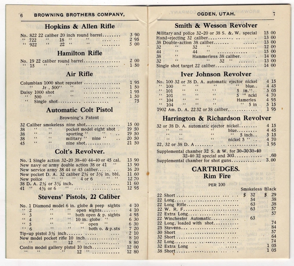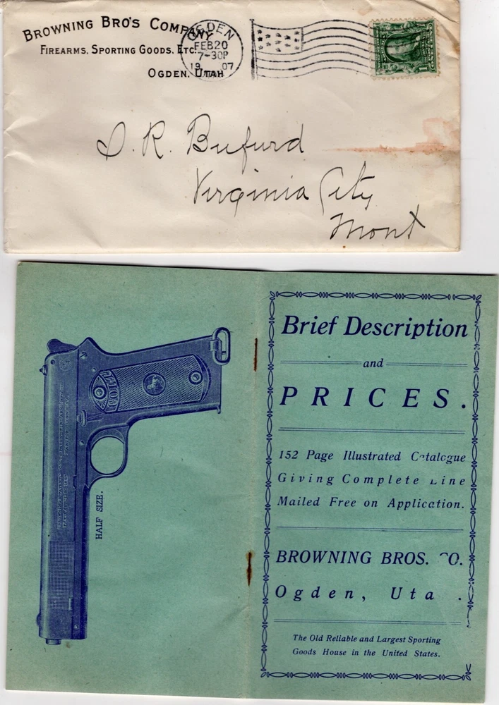 1907 Browning Brother's cover Ogden, Utah with 40 page catalog (3 1/2 x 6 inches) - guns, fishing, hunting gear, tents, cartridges, dog supplies, Kodak cameras, & sporting goods (football, baseball, tennis, etc.). Sent to S. R. Buford at Virginia City, Montana. Stain on front & back of cover. Firearms, rifles, shotguns, pistols, Winchester, Remington, Marlin, Smith, Parker, Ithaca, Baker, Stevens, Savage, Hopkins & Allen, Hamilton, Colt, Smith & Wesson, Iver Johnson, Harrington & Richardson. UT, MT, Mont. FREE Shipping .