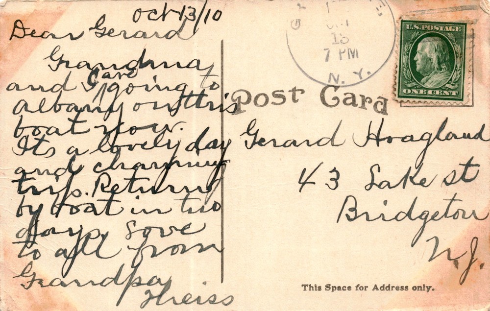 MAKE AN OFFER. THE MORE YOU BUY THE BETTER DEAL I WILL ACCEPT The postcard features an image of the Hudson River Day Line Steamer, Robert Fulton, which is copyrighted in 1909 by Bryant Union Publishing Co. The postcard is addressed to someone named Ger, postmarked from Albany, New York, and mentions a trip by boat with Gerard Hoagland.