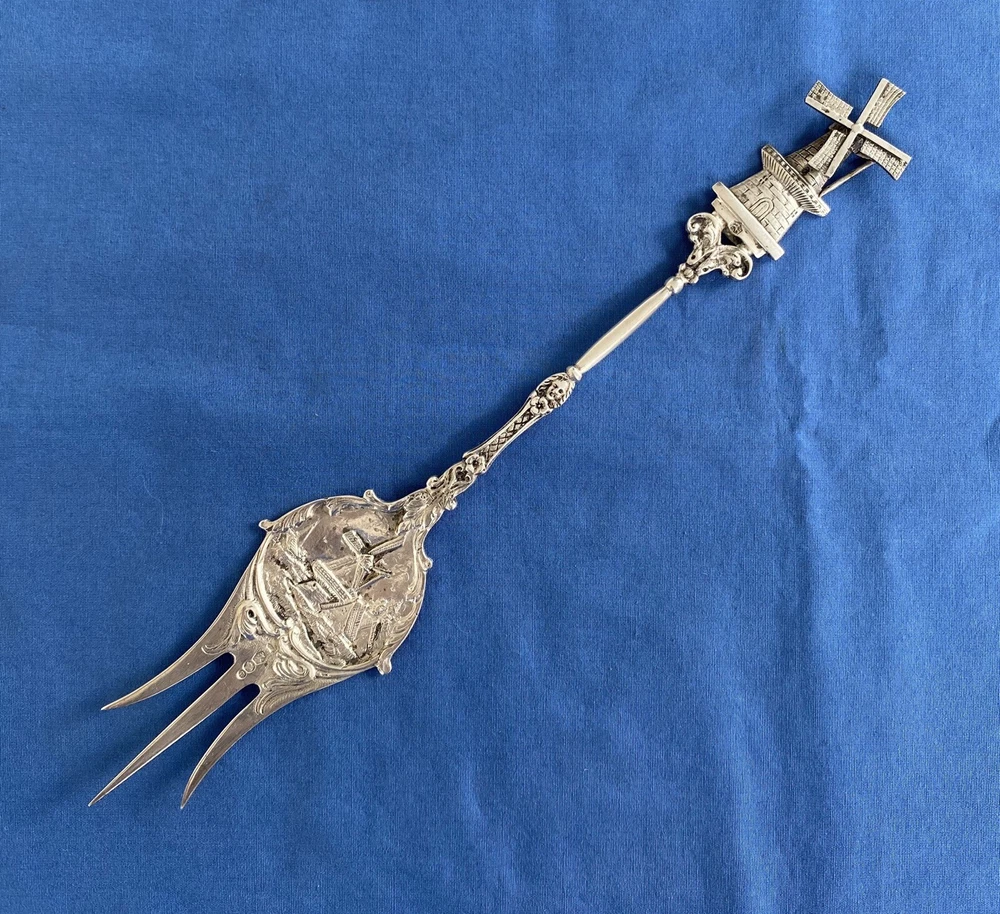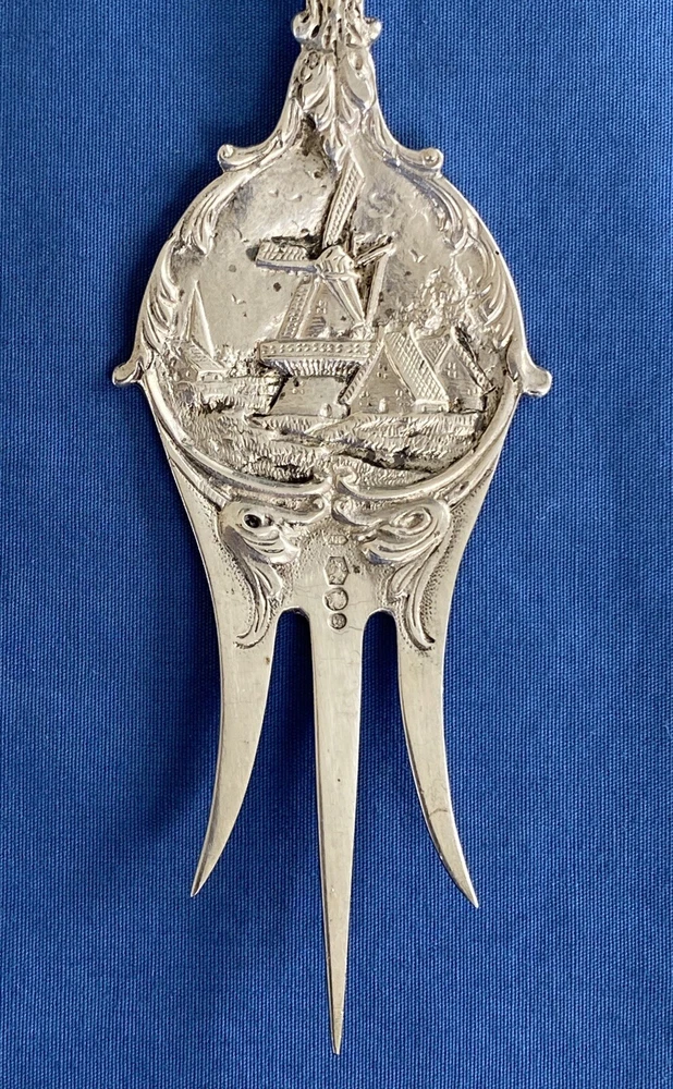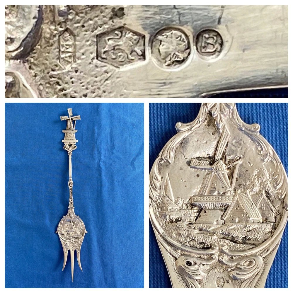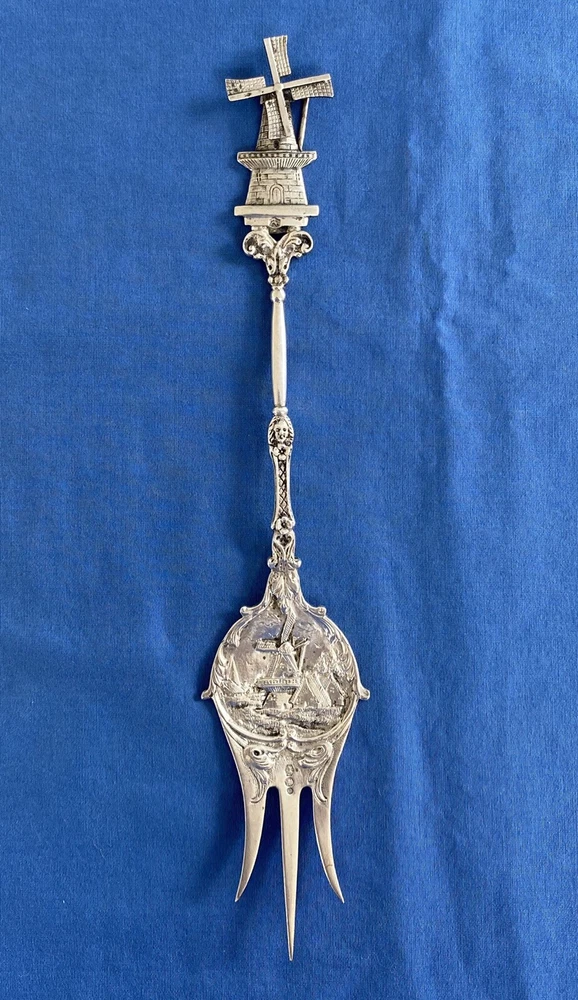 This listing is for a well-marked 1911 Antique Dutch Silver Windmill Serving Fork. This beautiful fork measures 9 1/4" and weighs 51 grams or 1.64 troy ounces. On the top of the handle is a windmill with moving blades. Above the tines of the fork is pictured a windmill and and a couple of houses. There are several hallmarks on this serving fork. On one of the windmill blades is the silver sword mark used between 1906-1953. At the base of the windmill is the Lion Passant mark with the number 2 which represents a level of silver fineness of at least 0.833 which means at least 83% silver. Above the tines are 4 different marks. It is marked "AM" for the silversmith, another Lion Passant mark with the number 2, the Minerva Head which is a duty mark with the letter "M" in its hair for Schoonhoven assay office (which of the 17 assay offices), and finally the letter B in a circle which is the date mark for 1911. It is interesting to think about the journey this serving fork took from the time the silversmith made this in 1911 until the time my grandfather purchased it sometime in the 1970s or 1980s in the United States. This fork lacks the export mark so it was originally made to be sold in the netherlands, but at some point someone, perhaps a tourist or perhaps someone moving to the states, brought it over. I have owned it since the early 1990s when it was given to me by my grandfather. This is in very good condition. Please see the photos for more detail. Money-back guarantee. This will be packed in bubblewrap and mailed in a cardboard box. Please feel free to ask any questions.