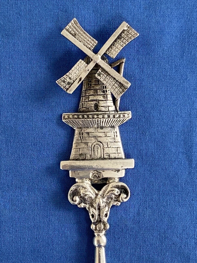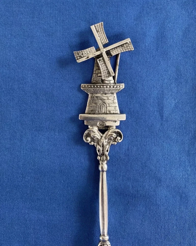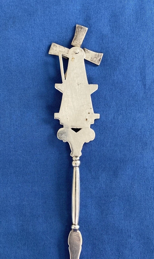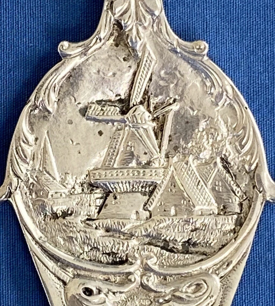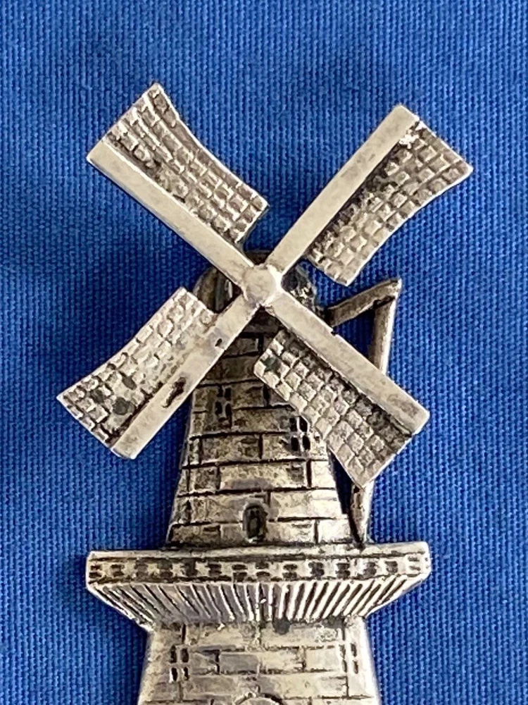 This listing is for a well-marked 1911 Antique Dutch Silver Windmill Serving Fork. This beautiful fork measures 9 1/4" and weighs 51 grams or 1.64 troy ounces. On the top of the handle is a windmill with moving blades. Above the tines of the fork is pictured a windmill and and a couple of houses. There are several hallmarks on this serving fork. On one of the windmill blades is the silver sword mark used between 1906-1953. At the base of the windmill is the Lion Passant mark with the number 2 which represents a level of silver fineness of at least 0.833 which means at least 83% silver. Above the tines are 4 different marks. It is marked "AM" for the silversmith, another Lion Passant mark with the number 2, the Minerva Head which is a duty mark with the letter "M" in its hair for Schoonhoven assay office (which of the 17 assay offices), and finally the letter B in a circle which is the date mark for 1911. It is interesting to think about the journey this serving fork took from the time the silversmith made this in 1911 until the time my grandfather purchased it sometime in the 1970s or 1980s in the United States. This fork lacks the export mark so it was originally made to be sold in the netherlands, but at some point someone, perhaps a tourist or perhaps someone moving to the states, brought it over. I have owned it since the early 1990s when it was given to me by my grandfather. This is in very good condition. Please see the photos for more detail. Money-back guarantee. This will be packed in bubblewrap and mailed in a cardboard box. Please feel free to ask any questions.