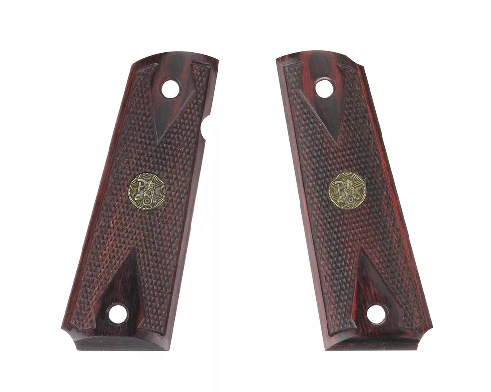 rosewood grip panels are hand matched to improve the style of any full-sized 1911. They are laser cut with precise checkering to improve the handling as well. Crafted in tough Dymondwood laminate, they carry tasteful medallions on both sides and are offered in double-diamond or half-checkered patterns. has also crafted-in important additional features like notches for ambidextrous safeties and a beveled grip bottom with a cut-out for the mainspring housing pin. Specifications: - Fits: Colt 1911 - Color: Double Diamond Rosewood - Weight: 3oz Highly polished rosewood laminate grips that provide a timeless look and perfectly accent blued and stainless handguns Superior Fit- Renegade wood grips are machined to exact specifications and will not wobble or shift on the handgun's frame Grip Texture- Double diamond checkering provides enhanced traction offering the user more control when drawing, and while firing Fits- 1911 Govt. and Commander sized pistols from manufacturers like: Colt, Kimber, Springfield Armory, Remington, Sig Sauer, Ruger, Rock Island Armory, Smith and Wesson, and more - We stand behind our high quality gun grips with a Limited