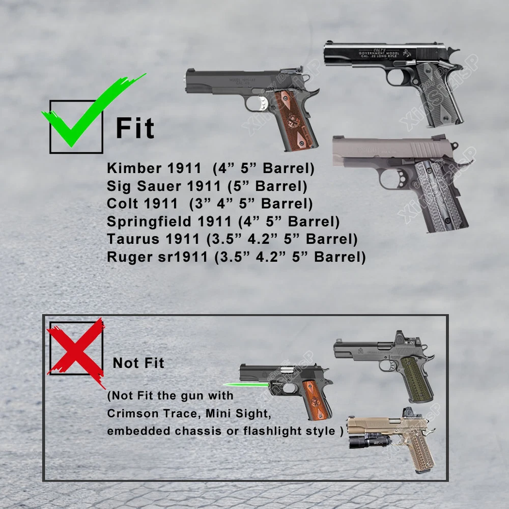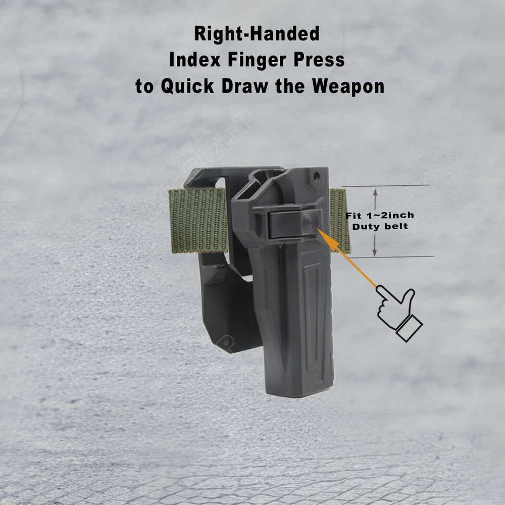 High Quality Military & Police Grade Polymer OWB Holster Specially Designed For Fast Draw During Duty Or Shooting Competition. Weapon Compatibility - Outside Waistband Tactical H olster for Non-Railed Versions of 1911 Models (For 9mm, .40 only). Holster fit 1911 Holster fit Dan Wesson Dan Wesson Specialist 5" 9mm Luger Dan Wesson Guardian 4.25" 9mm Luger 1911 Holster fit Ed Brown Ed Brown Special Forces 5" 9mm Luger Ed Brown Kobra Carry 4.25" 9mm Luger 1911 Holster fit Kimber Kimber 1911 5" 9mm Luger Kimber 1911 Pro 4" 9mm Luger Kimber Custom II 5" .40 S&W Kimber Pro Carry II 4" .40 S&W 1911 Holst er fit Nighthawk Custom Nighthawk Custom Talon 5" 9mm Luger 1911 Holste r fit Rock Island Armory (Armscor) Rock Island Armory 1911 Ultra FS 5" 9mm Luger Rock Island Armory 1911 FS Tactical 5" .40 S&W 1911 Hols ter fit Springfield Springfield 1911 EMP Champion 4" 9mm Luger Springfield 1911 Loaded 5" 9mm Luger Springfield Armory 1911 Loaded 5" .40 S&W Springfield Armory 1911 Loaded Target 5" .40 S&W 1911 Hols ter f it STI International (Staccato) STI Trojan 5" . 9mm Luger 1911 Hols ter fit Taurus Taurus 1911 5" 9mm Luger Taurus 1911 Commander 4.2" 9mm Luger 1911 Holste r fit Walther Walther Colt 1911 A1 5" .22 LR 1911 Holste r fit Wilson Combat Wilson Combat CQB 5" 9mm Luger ( I t perfect fit the 1911 gun without Optic Mount Mini Sight a bove on the end of the barrel , but also without laser and embedded chassis, and flashlight style ) Ease And Comfort Push side buttons to achieve the fast opening and closing, unique design allows for belt carrying or vest carrying, perfectly used by duty holsters, uniformed law enforcement officers, security personnel, military personnel, private persons, and shooting sports holsters. And it fits closer to the body which can achieve better concealment under clothes. High S afety Secure Level II Retention - Auto-locking system restrain pistol in the holster to ensure ultimate safety, activate the release by pressing the button with the index finger to achieve gun access Adjustable Easily set Holster 360 degrees to your desire position with Allen key, compatible belt width up to 2 inch Tough & Durable Material Custom-molded body made of polymer stronger than leather that will wear out, adapt to every bad environment In the Package: · 1*Holster with Paddle Attachment · 1*Allen Key Shipping: Ships same day or next except Sundays and Holidays ! Free shipping! Ship by USPS First Class Package. 100% MONEY BACK GUARANTEE. Any question please be free to contact with us First .Thanks!