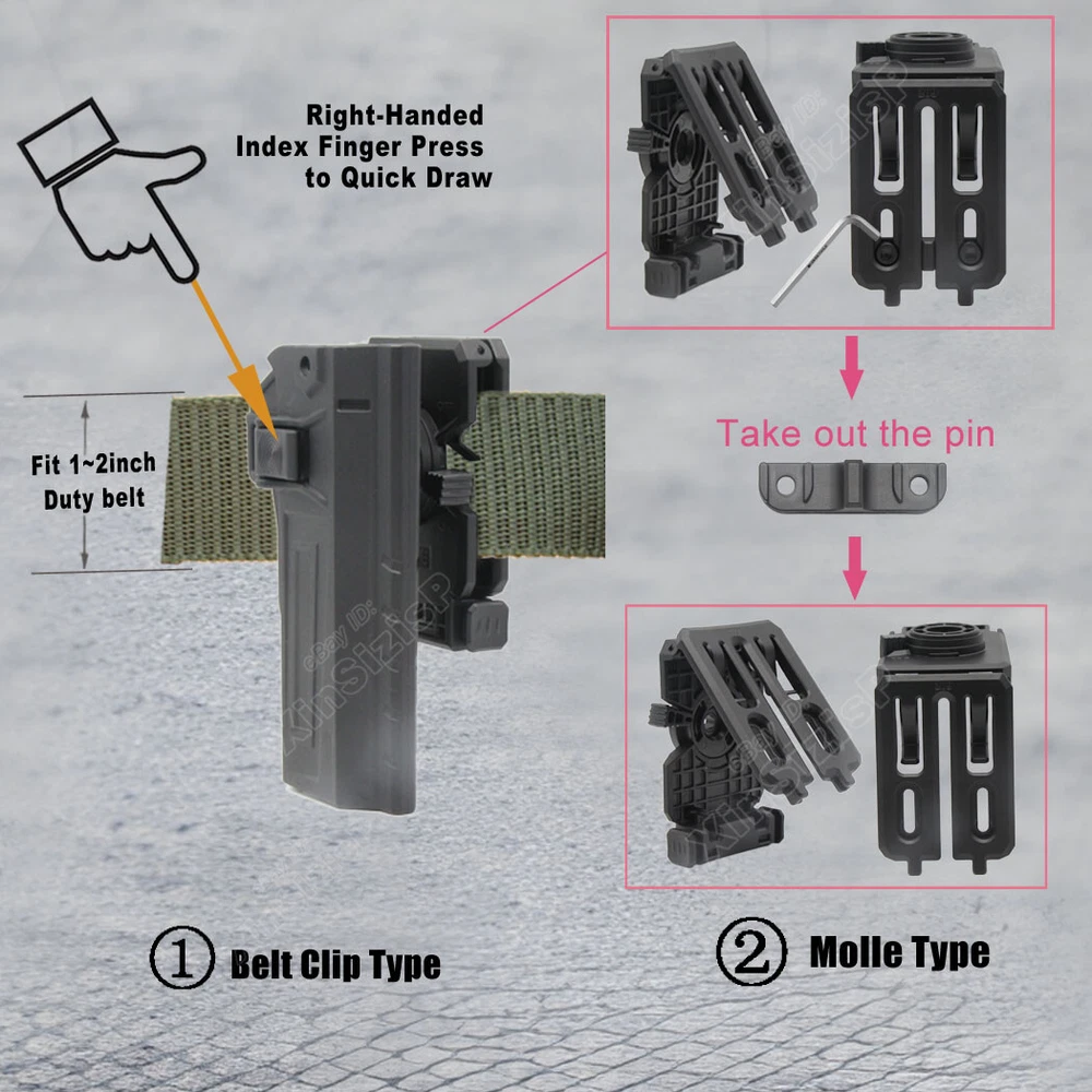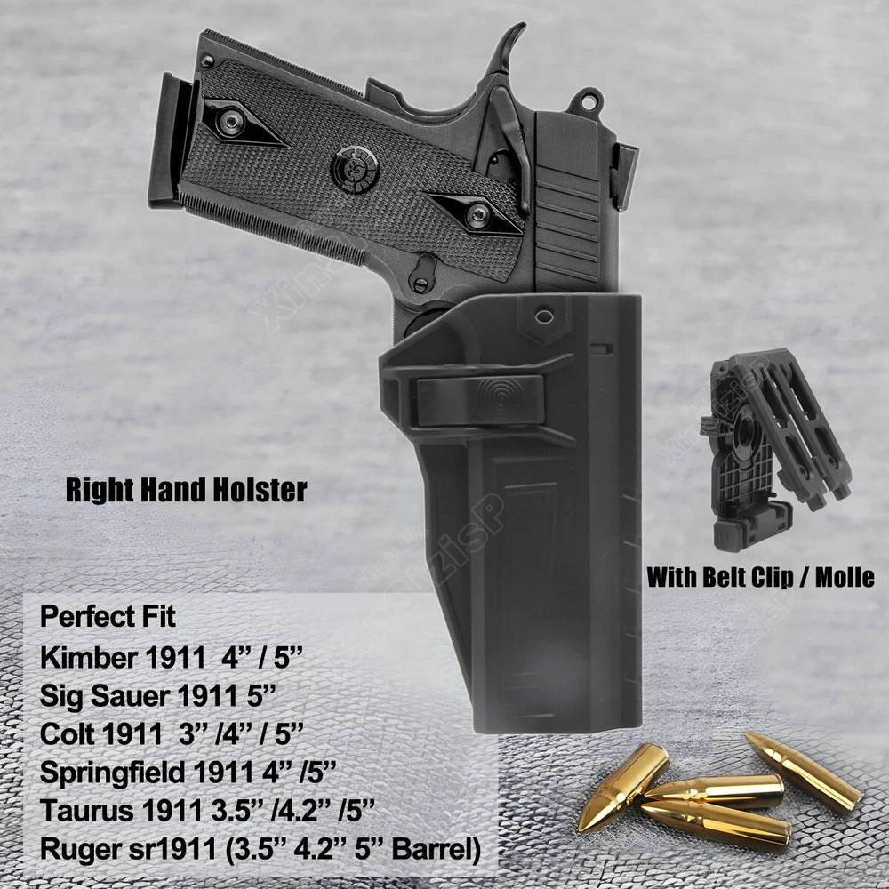 High Quality Military & Police Grade Polymer OWB Holster Specially Designed For Fast Draw During Duty Or Shooting Competition. Outside Waistband Tactical H olster with Belt Clip method for Non-Railed Versions of 1911 Models (For 9mm, .40 only). Holster fit 1911 Holster fit Dan Wesson Dan Wesson Specialist 5" 9mm Luger Dan Wesson Guardian 4.25" 9mm Luger 1911 Holster fit Ed Brown Ed Brown Special Forces 5" 9mm Luger Ed Brown Kobra Carry 4.25" 9mm Luger 1911 Holster fit Kimber Kimber 1911 5" 9mm Luger Kimber 1911 Pro 4" 9mm Luger Kimber Custom II 5" .40 S&W Kimber Pro Carry II 4" .40 S&W 1911 Holst er fit Nighthawk Custom Nighthawk Custom Talon 5" 9mm Luger 1911 Holste r fit Rock Island Armory (Armscor) Rock Island Armory 1911 Ultra FS 5" 9mm Luger Rock Island Armory 1911 FS Tactical 5" .40 S&W 1911 Hols ter fit Springfield Springfield 1911 EMP Champion 4" 9mm Luger Springfield 1911 Loaded 5" 9mm Luger Springfield Armory 1911 Loaded 5" .40 S&W Springfield Armory 1911 Loaded Target 5" .40 S&W 1911 Hols ter f it STI International (Staccato) STI Trojan 5" . 9mm Luger 1911 Hols ter fit Taurus Taurus 1911 5" 9mm Luger Taurus 1911 Commander 4.2" 9mm Luger 1911 Holste r fit Walther Walther Colt 1911 A1 5" .22 LR 1911 Holste r fit Wilson Combat Wilson Combat CQB 5" 9mm Luger ( I t perfect fit the 1911 gun without Optic Mount Mini Sight a bove on the end of the barrel , but also without laser and embedded chassis, and flashlight style ) Ease And Comfort Push side buttons to achieve the fast opening and closing, unique design allows for belt carrying or vest carrying, perfectly used by duty holsters, uniformed law enforcement officers, security personnel, military personnel, private persons, and shooting sports holsters. And it fits closer to the body which can achieve better concealment under clothes. High S afety Secure Level II Retention - Auto-locking system restrain pistol in the holster to ensure ultimate safety, activate the release by pressing the button with the index finger to achieve gun access Adjustable Easily set Holster 360 degrees to your desire position with Allen key, compatible belt width up to 2 inch Tough & Durable Material Custom-molded body made of polymer stronger than leather that will wear out, adapt to every bad environment In the Package: · 1*Holster with Paddle Attachment · 1*Allen Key Shipping: Ships same day or next except Sundays and Holidays ! Free shipping! Ship by USPS First Class Package. 100% MONEY BACK GUARANTEE. Any question please be free to contact with us First .Thanks!