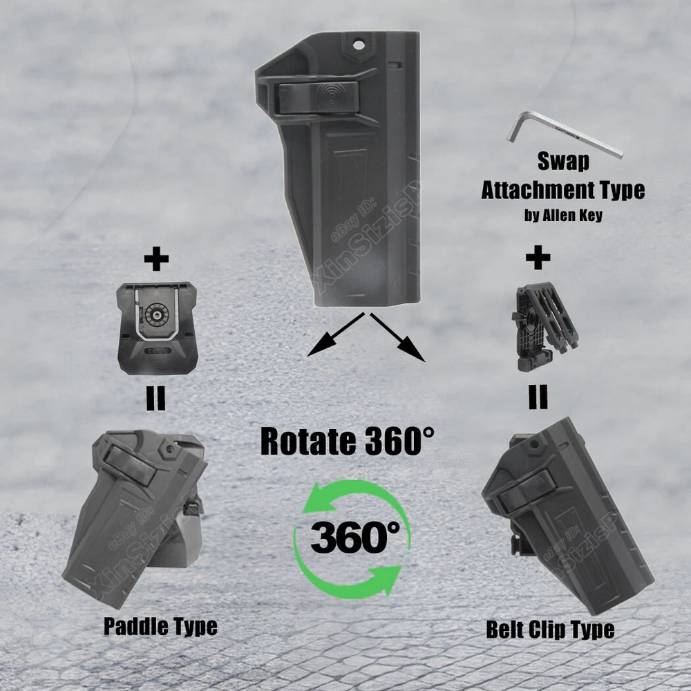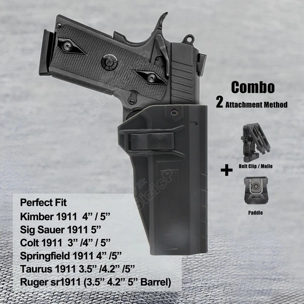 This is a Combo Holster Comes With Paddle and Belt Clip Attachment ,which means you can swap paddle type to belt clip type with the Allen key by yourself. High Quality Military & Police Grade Polymer OWB Holster Specially Designed For Fast Draw During Duty Or Shooting Competition. Weapon Compatibility - Outside Waistband Tactical H olster for Non-Railed Versions of 1911 Models (For 9mm, .40 only). Holster fit 1911 Holster fit Dan Wesson Dan Wesson Specialist 5" 9mm Luger Dan Wesson Guardian 4.25" 9mm Luger 1911 Holster fit Ed Brown Ed Brown Special Forces 5" 9mm Luger Ed Brown Kobra Carry 4.25" 9mm Luger 1911 Holster fit Kimber Kimber 1911 5" 9mm Luger Kimber 1911 Pro 4" 9mm Luger Kimber Custom II 5" .40 S&W Kimber Pro Carry II 4" .40 S&W 1911 Holst er fit Nighthawk Custom Nighthawk Custom Talon 5" 9mm Luger 1911 Holste r fit Rock Island Armory (Armscor) Rock Island Armory 1911 Ultra FS 5" 9mm Luger Rock Island Armory 1911 FS Tactical 5" .40 S&W 1911 Hols ter fit Springfield Springfield 1911 EMP Champion 4" 9mm Luger Springfield 1911 Loaded 5" 9mm Luger Springfield Armory 1911 Loaded 5" .40 S&W Springfield Armory 1911 Loaded Target 5" .40 S&W 1911 Hols ter f it STI International (Staccato) STI Trojan 5" . 9mm Luger 1911 Hols ter fit Taurus Taurus 1911 5" 9mm Luger Taurus 1911 Commander 4.2" 9mm Luger 1911 Holste r fit Walther Walther Colt 1911 A1 5" .22 LR 1911 Holste r fit Wilson Combat Wilson Combat CQB 5" 9mm Luger ( I t perfect fit the 1911 gun without Optic Mount Mini Sight a bove on the end of the barrel , but also without laser and embedded chassis, and flashlight style ) Ease And Comfort Push side buttons to achieve the fast opening and closing, unique design allows for belt carrying or vest carrying, perfectly used by duty holsters, uniformed law enforcement officers, security personnel, military personnel, private persons, and shooting sports holsters. And it fits closer to the body which can achieve better concealment under clothes. High S afety Secure Level II Retention - Auto-locking system restrain pistol in the holster to ensure ultimate safety, activate the release by pressing the button with the index finger to achieve gun access Adjustable Easily set Holster 360 degrees to your desire position with Allen key, compatible belt width up to 2 inch Tough & Durable Material Custom-molded body made of polymer stronger than leather that will wear out, adapt to every bad environment In the Package: · 1*Holster with Paddle Attachment · 1*Allen Key Shipping: Ships same day or next except Sundays and Holidays ! Free shipping! Ship by USPS First Class Package. 100% MONEY BACK GUARANTEE. Any question please be free to contact with us First .Thanks!