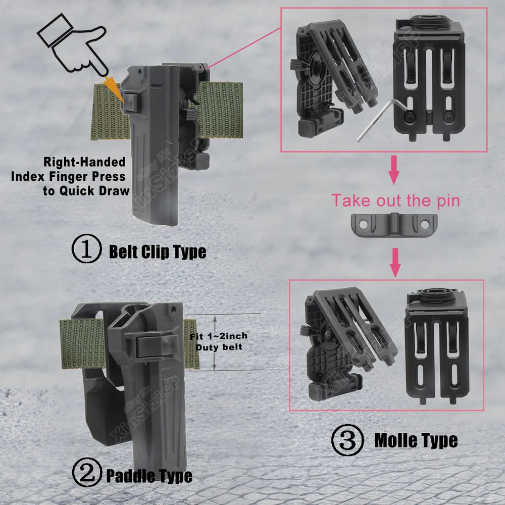 This is a Combo Holster Comes With Paddle and Belt Clip Attachment ,which means you can swap paddle type to belt clip type with the Allen key by yourself. High Quality Military & Police Grade Polymer OWB Holster Specially Designed For Fast Draw During Duty Or Shooting Competition. Weapon Compatibility - Outside Waistband Tactical H olster for Non-Railed Versions of 1911 Models (For 9mm, .40 only). Holster fit 1911 Holster fit Dan Wesson Dan Wesson Specialist 5" 9mm Luger Dan Wesson Guardian 4.25" 9mm Luger 1911 Holster fit Ed Brown Ed Brown Special Forces 5" 9mm Luger Ed Brown Kobra Carry 4.25" 9mm Luger 1911 Holster fit Kimber Kimber 1911 5" 9mm Luger Kimber 1911 Pro 4" 9mm Luger Kimber Custom II 5" .40 S&W Kimber Pro Carry II 4" .40 S&W 1911 Holst er fit Nighthawk Custom Nighthawk Custom Talon 5" 9mm Luger 1911 Holste r fit Rock Island Armory (Armscor) Rock Island Armory 1911 Ultra FS 5" 9mm Luger Rock Island Armory 1911 FS Tactical 5" .40 S&W 1911 Hols ter fit Springfield Springfield 1911 EMP Champion 4" 9mm Luger Springfield 1911 Loaded 5" 9mm Luger Springfield Armory 1911 Loaded 5" .40 S&W Springfield Armory 1911 Loaded Target 5" .40 S&W 1911 Hols ter f it STI International (Staccato) STI Trojan 5" . 9mm Luger 1911 Hols ter fit Taurus Taurus 1911 5" 9mm Luger Taurus 1911 Commander 4.2" 9mm Luger 1911 Holste r fit Walther Walther Colt 1911 A1 5" .22 LR 1911 Holste r fit Wilson Combat Wilson Combat CQB 5" 9mm Luger ( I t perfect fit the 1911 gun without Optic Mount Mini Sight a bove on the end of the barrel , but also without laser and embedded chassis, and flashlight style ) Ease And Comfort Push side buttons to achieve the fast opening and closing, unique design allows for belt carrying or vest carrying, perfectly used by duty holsters, uniformed law enforcement officers, security personnel, military personnel, private persons, and shooting sports holsters. And it fits closer to the body which can achieve better concealment under clothes. High S afety Secure Level II Retention - Auto-locking system restrain pistol in the holster to ensure ultimate safety, activate the release by pressing the button with the index finger to achieve gun access Adjustable Easily set Holster 360 degrees to your desire position with Allen key, compatible belt width up to 2 inch Tough & Durable Material Custom-molded body made of polymer stronger than leather that will wear out, adapt to every bad environment In the Package: · 1*Holster with Paddle Attachment · 1*Allen Key Shipping: Ships same day or next except Sundays and Holidays ! Free shipping! Ship by USPS First Class Package. 100% MONEY BACK GUARANTEE. Any question please be free to contact with us First .Thanks!
