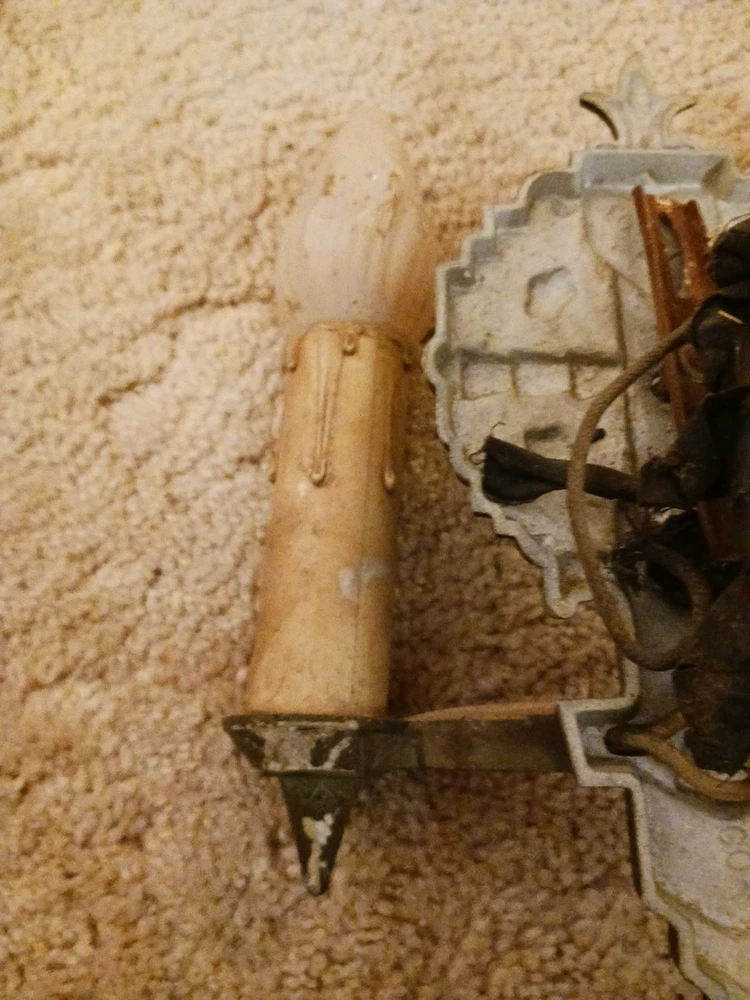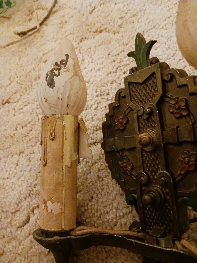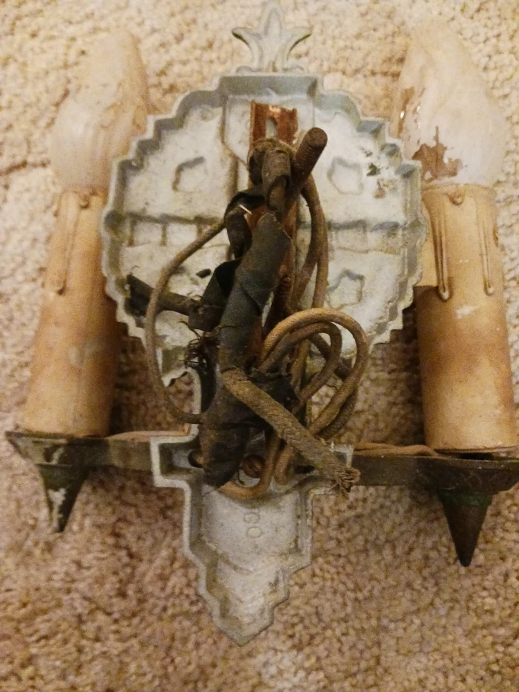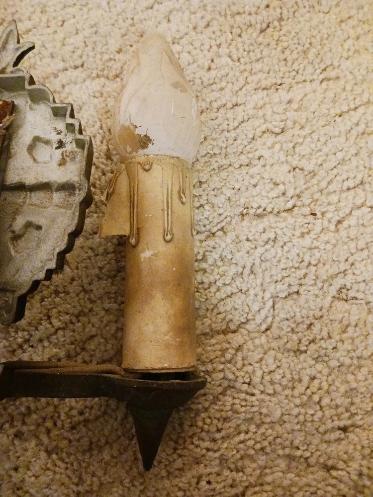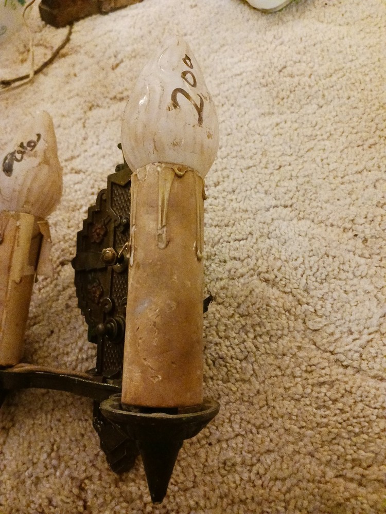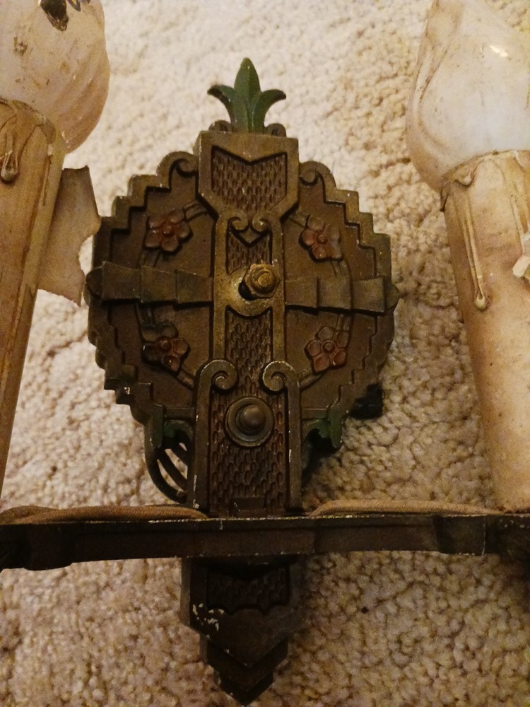 1920's-30's Art Deco Wall Sconce Lamp Made By Mich Chan Co. There is paper peeling off of the candle stick portion of the socket on one side. There is sharpie writing on each bulb. Each bulb has paint chipping off. There is paint chipping off of various areas on the lamp. This fixture has not been tested. Very neat original light fixture. Would look great in a period correct home. This piece may require some cleaning.