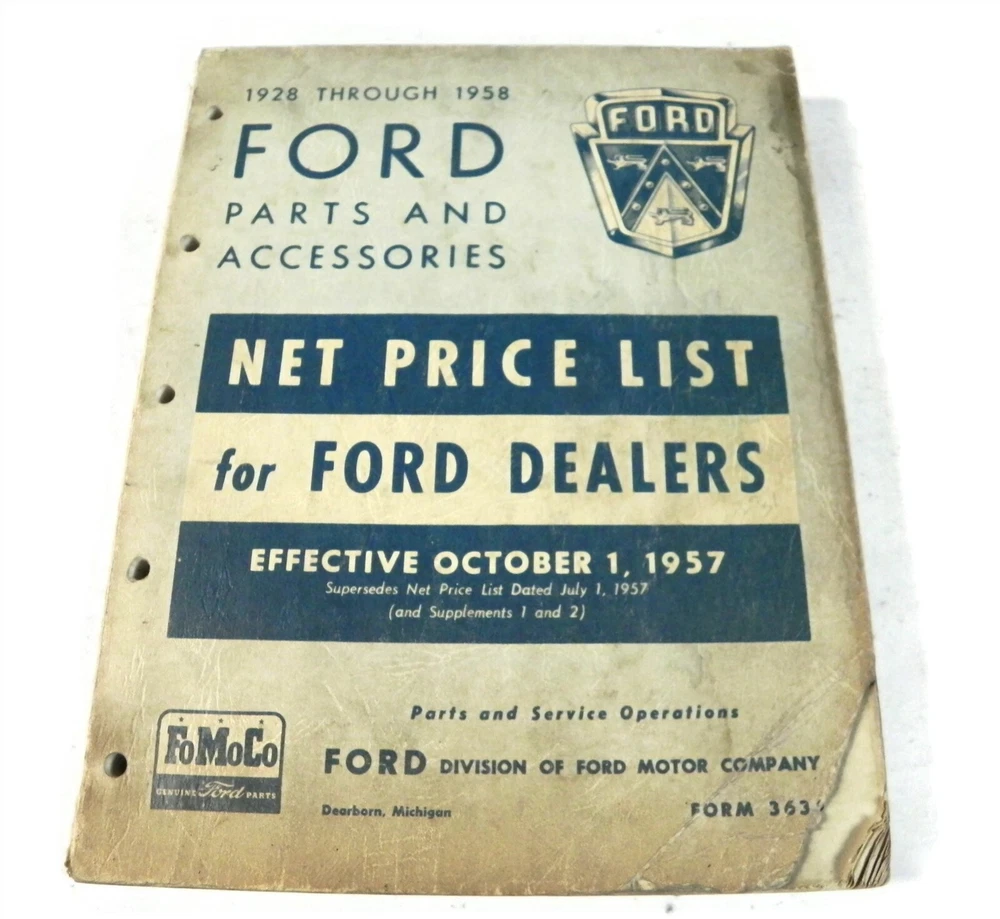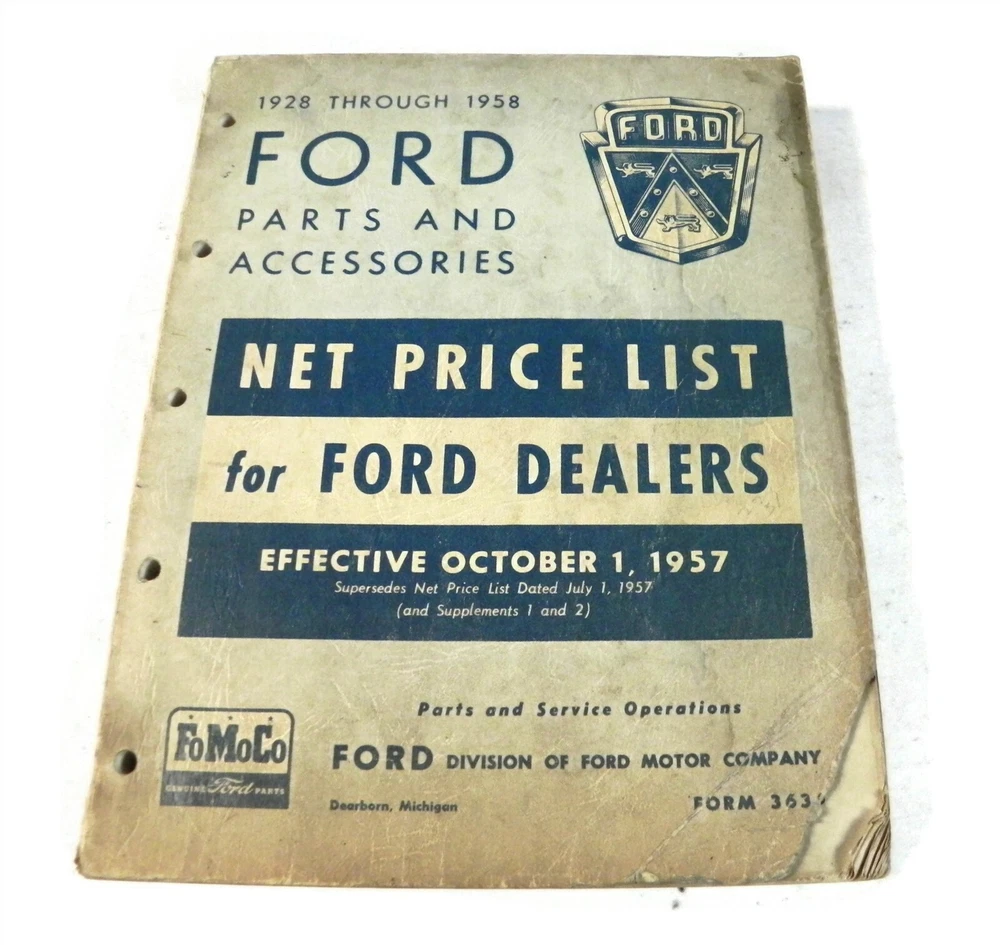 1928-1948 FORD PARTS AND ACCESSORIES NET PRICE LIST FOR DEALERS CATALOG MANUAL Original FORD publication-Not a cheap reprint 1928-1948 FORD PARTS AND ACCESSORIES NET PRICE LIST FOR DEALERS CATALOG MANUAL SPINE TIGHT. NO LOOSE PAGES See photos below for details. ABOUT US Jones Vintage Parts has been a family-owned business for over 40 years. We specialize in rare and vintage NOS and used parts for all makes and models from the teens to the 70s. We're passionate about uncovering and restoring the stories of the treasures from your grandparents and great grandparents history. We believe in breathing new life into the world's first modes of transportation. New vintage all the time! SHIPPING INFORMATION Purchased items will generally ship Monday through Friday, within 3 days via USPS Flat Rate or First Class upon payment receipt. Larger items will be shipped via FedEx Ground or UPS. Multiple same-day purchases will be combined for discounted shipping (request a revised invoice to receive bulk shipping discount or notify us of future purchases). International shipping also available. RETURN POLICY Our goal is your satisfaction. If you are unhappy with your order for any reason items may be returned for parts credit within three (3) days of receipt, and you will be charged a 10% restocking fee. There are no shipping refunds. Exchanges will be billed appropriate freight. All return items must be complete, undamaged, unaltered and in resale condition. You may be interested in our other eBay listings . Powered by SixBit's eCommerce Solution