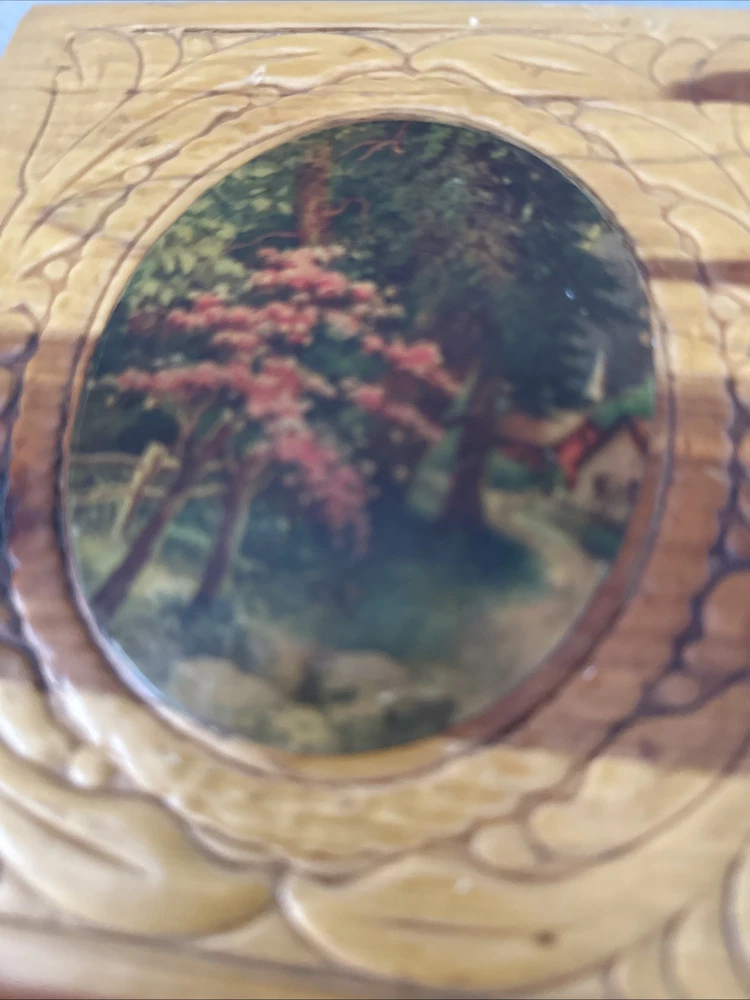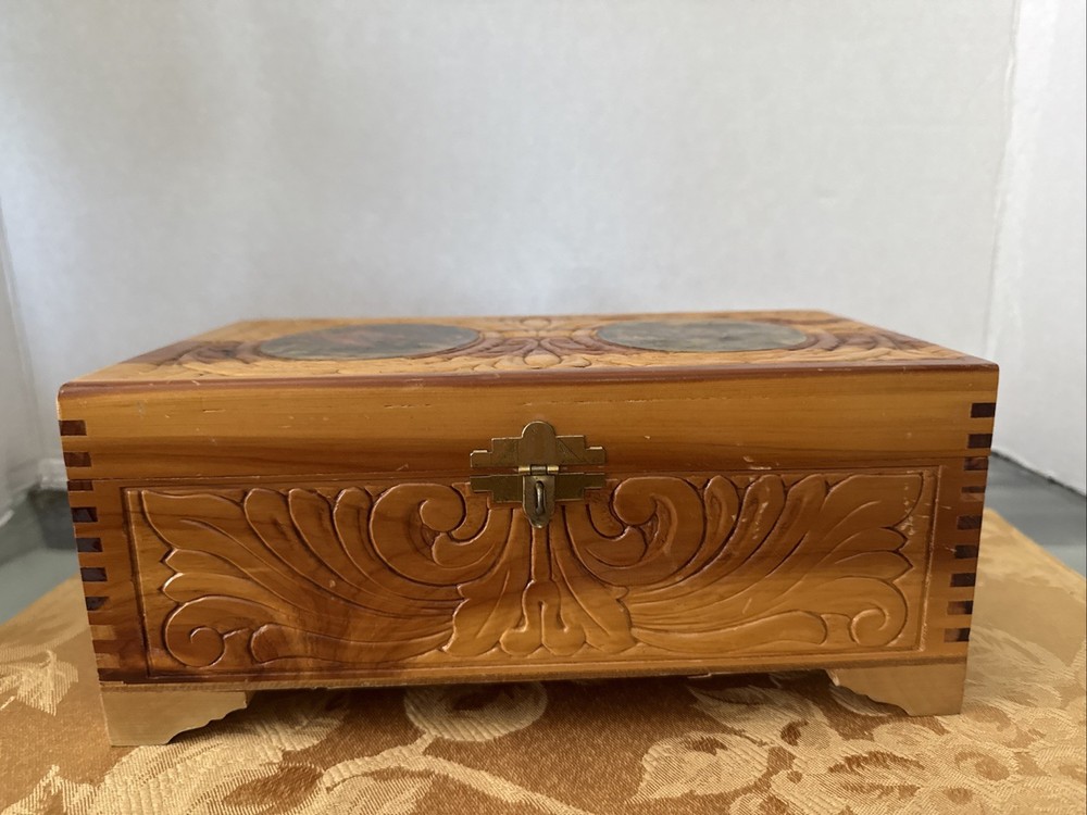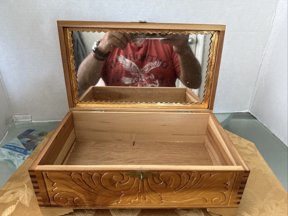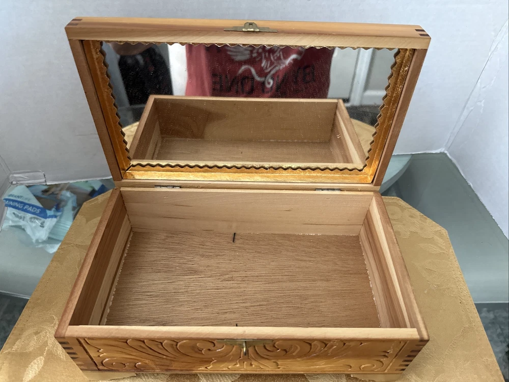 This exquisite jewelry box from the 1930s is a stunning piece of art deco craftsmanship. The carved wood design features beautiful Italian river prints and a mirrored finish. With a size of 10.5 inches in length and 6 inches in width, this medium-sized box is perfect for storing your precious jewelry and keepsakes. The box is made of high-quality cedar and is adorned with a vintage brand label. It has a unique character of Lake Como and is suitable for all occasions. This collectible item is perfect for adults who appreciate the beauty and craftsmanship of vintage jewelry boxes. It is a must-have for those who love the art deco style and want to add a touch of elegance to their home decor. Look at the pictures before making your purchase