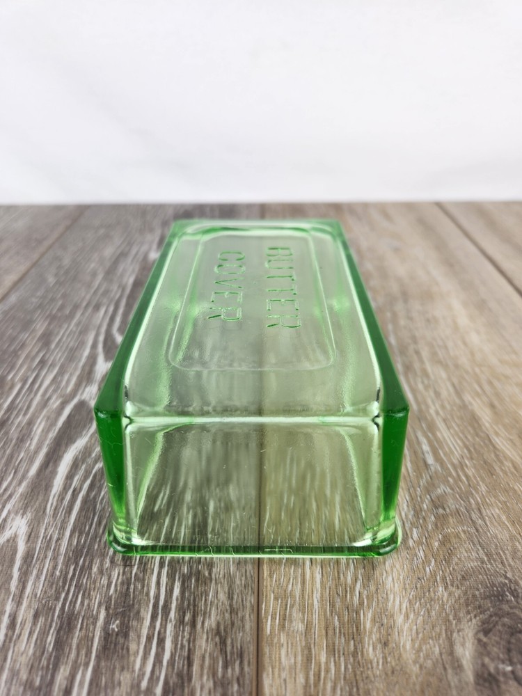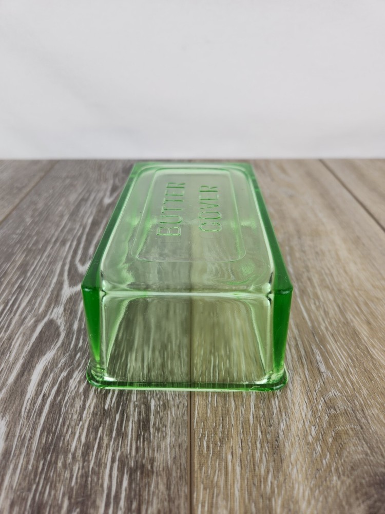 This Hazel Atlas green uranium glass butter dish lid is a perfect replacement for your vintage set. Dating back to the 1930s, the Art Deco design and luminous glow under UV light make it a sought-after piece for collectors. Whether restoring a butter dish or adding to your uranium glass collection, this replacement lid offers charm and authenticity. This could also be used as a simple bowl or dish for storing things without the bottom at all. This butter dish lid is 6" x 3.75" x 2". It is embossed with "Butter Cover" on the top of the lid. The UV Photo taken here is with 395nm blacklight, but it will also glow under 365nm.