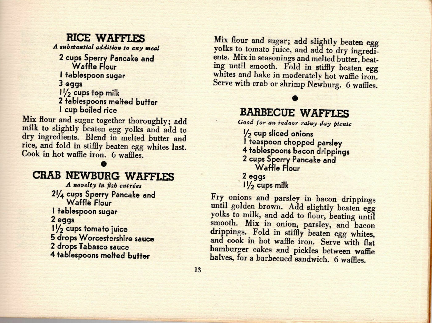 This is a 1934 advertising cookbook published for Sperry Pancake & Waffle Flour.  The author is Martha Meade.  It has 32 pages of recipes and is in very nice condition.  It is bound with staples and has a bit of wear along the spine but is overall in great condition.  It is7 & 1/4" by 5 & 1/4".