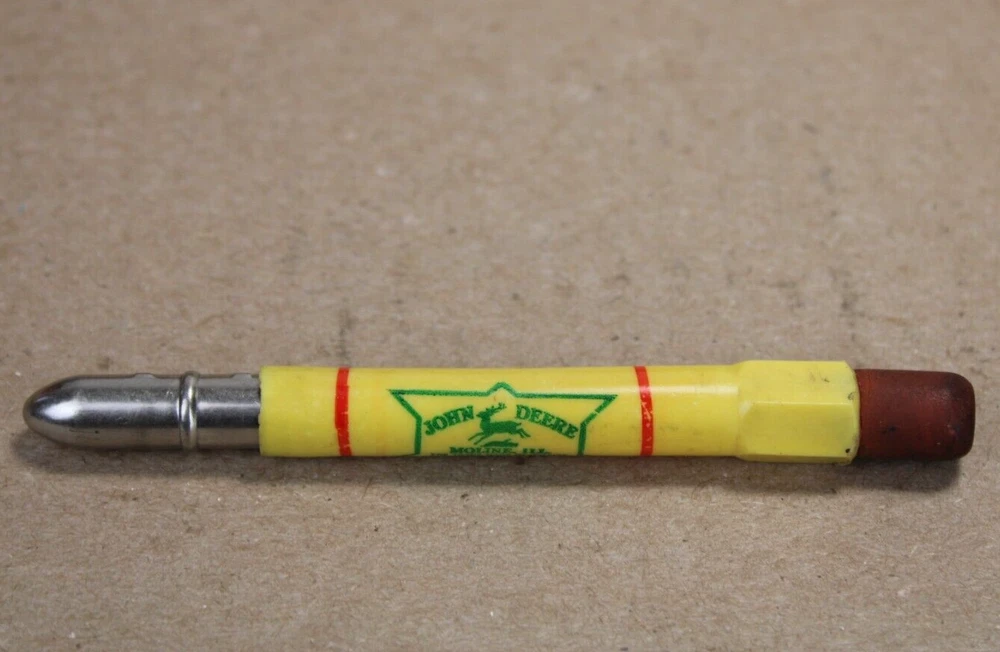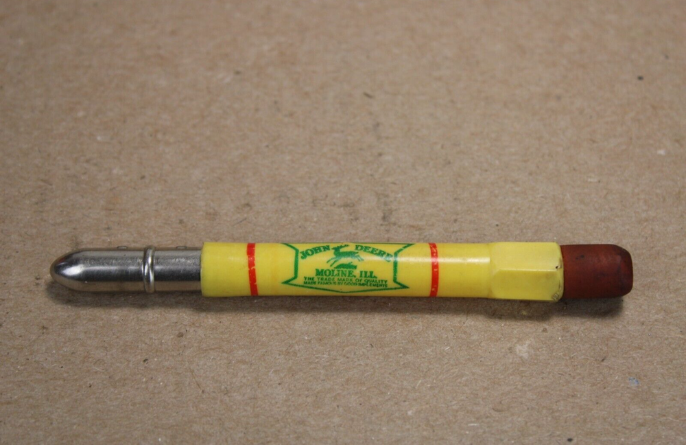 THE MORE YOU BUY---THE MORE YOU SAVE ON SHIPPING-- USPS POSTAL RATES HAVE WENT UP AGAIN SO I HAVE TO CHARGE MORE FOR SHIPPING......... I COMBINE SHIPPING TO SAVE THE BUYER MONEY....PLEASE WAIT TO PAY UNTIL ALL THE AUCTIONS ARE OVER AND I WILL SEND YOU A COMBINED INVOICE. ..... Check out the photos of all the other old oil cans that I currently have on ebay. This bullet pencil is in nice shape and dates from 1937 . It is an old original with no touch ups or repairs. Not 100% mint (nothing is to me) but extra nice as you can see. Photos show all sides....it could use a good cleaning and shows wear. Please look at all photos before bidding. Some imperfections but still a nice old John Deere item. Photos show condition. It's an old one and it's GUARANTEED authentic. I DO NOT sell reproductions Please use the zoom and look closely at each photo to get a sure fire read of the condition before bidding. . PAYMENT EXPECTED WITHIN 10 DAYS OF AUCTIONS END. God Bless & Happy Bidding I SELL OLD A DVERTISING WHICH MOST ITEMS HAVE BEEN USED AND ARE IN USED CONDITION. I HAVE BEEN IN THE ANTIQUE ADVERTISING BUSINESS FOR OVER 30 YEARS AND I HAVE NEVER SEEN AN ABSOLUTE MINT ITEM THAT HAS BEEN USED BUT I HAVE SEEN A LOT OF STUFF THAT HAS BEEN USED VERY LITTLE THAT IS IN GREAT SHAPE AND WELL TAKEN CARE OF. LOOK CLOSELY AT MY PICTURES AND PLEASE, PLEASE ASK QUESTIONS BEFORE BIDDING.