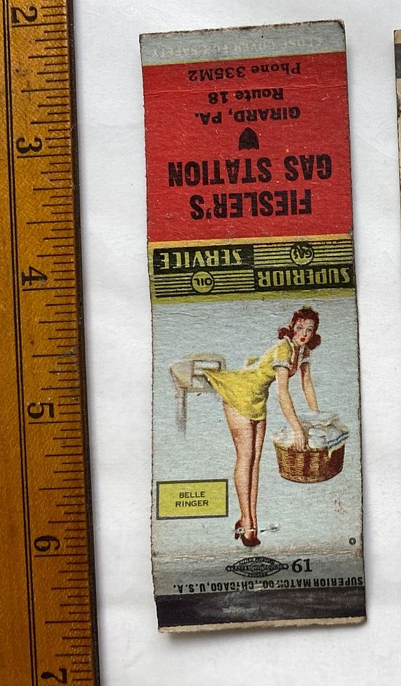 1940's Pin-up Matchbook. Fiesler's Gas Station. Girard, Pennsylvania. Matches have been removed. VG condition. Slight edge and corner wear, some soiling, scuffing on the striker, light crease. I use a poor/fair/good/very good/excellent/mint grading system and grade very conservatively (see my feedback). This does NOT necessarily correspond to the generic Ebay grading system that we must use. Shipping is $1.50 in the U.S. International Buyers – Please Note Please obtain shipping quote before bidding. Import duties, taxes and charges are not included in the item price or shipping charges. These charges are the buyer's responsibility. Please check with your country's customs office to determine what these additional costs will be prior to bidding/buying. Thank you. We cannot be responsible for transit times through customs. THANKS FOR LOOKING! WE NOW HAVE OUR EBAY STORE! CHECK IT OUT FOR MORE VINTAGE ITEMS. Track Page Views With Auctiva's FREE Counter