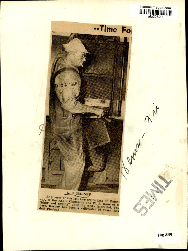 ebay template Note: Please study the images carefully to determine the condition of this vintage photograph, as it may not be in perfect condition. It may contain wrinkles, cracks, and possibly even tears due to its age and how it was handled before it got to us. A scanner may interpret colors and contrast differently than human eyes will, so it is possible that the actual photograph may be slightly darker or lighter in person. This vintage photograph is offered for sale as a collectible item and conveys no transfer of copyright. 1940 Press Photo Railroader G.S. Harney holding a bucket and smoking a cigarette This is an original press photo. G.S. Harney. Engineers of the last two trains into St. Peters... ...ney, of the ACL's Champion and W.R. One of the .... fishin' and resting" until the strike is settled. The ... here. Harney has been a railroader 40 years.Photo measures 7 x 9.25inches. Photo is dated 05-24-1940. PHOTO FRONT PHOTO BACK Historic Images Part Number: afa22820 FAQs Q: Can I just download a digital version instead? A: No, we sell only vintage originals and do not make or distribute any copies, including digital ones. Q: Do you combine shipping and invoices? A: Multiple photos won on the same seller ID combine automatically through the eBay checkout process. If you encounter problems with this, send us a message via eBay messaging and we will send you an invoice. Due to eBay limitations, we cannot combine items won on our different seller IDs for a single shipping charge. Q: How quickly do you ship the items once paid? A: We ship within one business day after your payment clears. If you do not receive an "order shipped" email from us by the close of the second business day from submitting payment, please e-mail us via eBay messaging. Q: How do you make sure my photograph arrives safely? A: We package each order between two cross-corrugated pieces of cardboard to ensure that the package is as difficult to bend as possible. We then wrap each order in a plastic sheet to help protect against moisture. We want you to rest assured that we take every precaution to ensure that the photograph you receive will be in the same condition in your care as it was in ours. Q: Will the "Historic Images" watermark be on my photo when I receive it? A: No. This is a digital watermark we use to protect our images. It is not printed on the photo. Q: What are your office hours? A: eBay for us is a business, and a very fun one to be in! We are open M-F 9 to 5 (CST). Therefore, we do not return e-mails and phone calls over the weekend. We observe the following holidays: New Years Day, Memorial Day, Fourth of July, Labor Day, Thanksgiving and the day after Thanksgiving, Christmas Eve and Christmas Day. Q: Where did all these vintage photos come from? A: These original vintage photographs are from various news service and newspaper photo archives from locations around the country including: Boston, Detroit, Tampa, Chicago, Denver, Seattle, New Orleans, Milwaukee, Portland, Spokane, and more. We do not copy or reproduce any photographs -- every item is a unique vintage piece that was housed in a news archive. Q: Can I use this photograph in my book/blog/website? A: The short answer is no. There is no transfer of copyright for republication or reproduction with these photographs when you purchase them, and only photographs taken before 1923 are currently automatically in the public domain. Permission from the copyright holder, which usually can be identified from the back of each photo, must be sought to republish or reproduce the image for any purpose. Q: Do you relist items (in case I miss an auction ending)? A: Auction items that receive no bids are relisted in our store (historicimages-store on eBay) as a fixed-price item and at a higher price than the starting auction price. Q: Do you leave feedback? A: Yes, we always leave feedback for buyers. Our software monitors when our buyers leave us feedback, then notifies us that we can leave feedback for the buyer. Rest assured, if you leave feedback, we will do the same! Check out our family of eBay IDs: historicimages01 Sports Photos historicimages02 Entertainment Photos historicimages03 Americana Photos historicimages04 International & War Photos historicimages05 Transportation Photos historicimages06 Photos of All Subjects historicimages07 Entertainment Photos historicimages08 Newsworthy Photos historicimages09 Entertainment Photos historicimages10 Sports Photos historicimages-store Our largest fixed-price selection historicimages-gallery Hand-picked photos Saturday night auctions About Us Historic Images was formed in September 2009, with a handful of scanners working out of a basement to digitize newspaper photo archives. We have since moved out of the basement, and we can now archive thousands of photos per day. Our company has worked with magazines and newspapers from Detroit, Boston, Denver, Seattle, Tampa, Chicago, and New Orleans, just to name a few. We are constantly adding to our inventory, and have assembled an archive of millions of photos to date. As our company evolved, we began our eBay business, which brings thousands of fresh auctions per week to the world's largest online auction marketplace. Our custom software systems and team of great employees allow us to efficiently scan and sell large photo archives online. At the very core of our company's DNA is a strong commitment to customer satisfaction and strict integrity for our product. Our promise to you is that we will do everything in our power to provide you a great buying experience. Copyright 2009 - Present, Historic Images, Inc. Sell Smarter with Kyozou. Inventory and Ecommerce Management