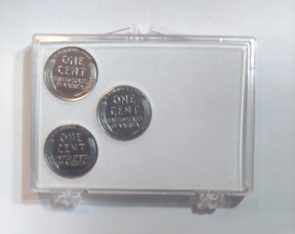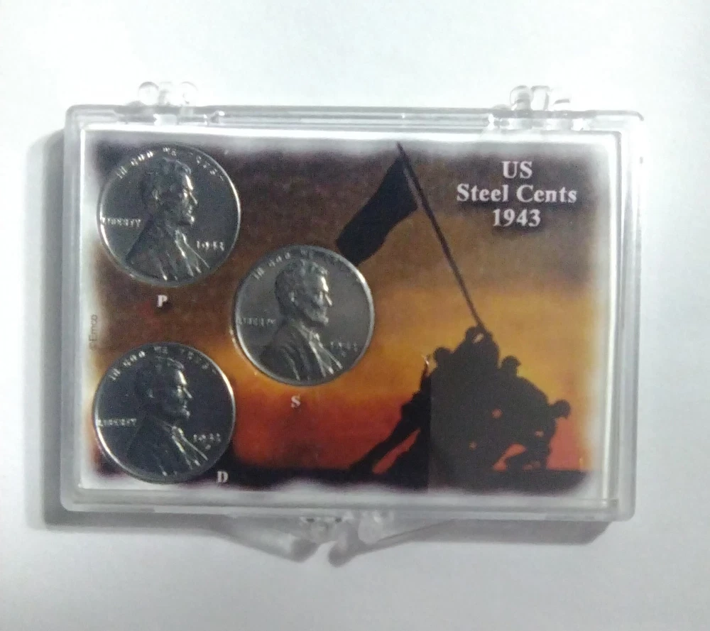 The product is a set of three circulated 1943 Steel Lincoln Wheat pennies from the Denver, San Francisco, and Philadelphia mints. These coins were minted during wartime and are made of steel due to the scarcity of copper at the time. The set includes a variety with a die crack, and it is uncertified. The coins are packaged in a custom pack, providing collectors with a piece of history from the United States during World War II.