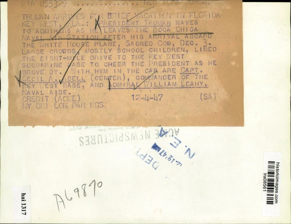 ebay template Note: Please study the images carefully to determine the condition of this vintage photograph, as it may not be in perfect condition. It may contain wrinkles, cracks, and possibly even tears due to its age and how it was handled before it got to us. A scanner may interpret colors and contrast differently than human eyes will, so it is possible that the actual photograph may be slightly darker or lighter in person. This vintage photograph is offered for sale as a collectible item and conveys no transfer of copyright. 1947 Press Photo President Harry Truman waves upon arrival in Key West, Florida This is an original press photo. Key West Florida - President Truman waves to admirers as he leaves the Boca Chica Naval Air Station after his arrival aboard the White House plane, Sacred Cow, December 3. Large crowds, mostly school children, lined the eight-mile drive to the Key West submarine base to cheer the president as he drove by. With him in the car are Captain Cecil A. Adell (center), commander of the Key West Base, and Admiral William Leahy, naval aide.Photo measures 8 x 6inches. Photo is dated 12-4-1947. PHOTO FRONT PHOTO BACK Historic Images Part Number: lra08561 Sell Smarter with Kyozou. Inventory and Ecommerce Management