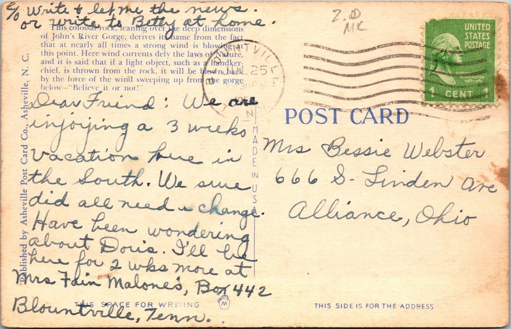1950s Blowing Rock NC Gorge Vintage Souvenir Postcard Western North Carolina