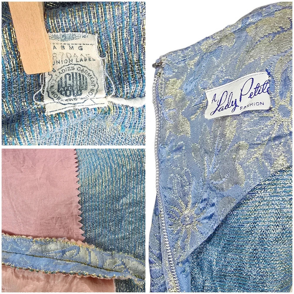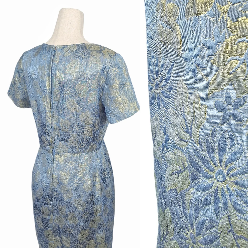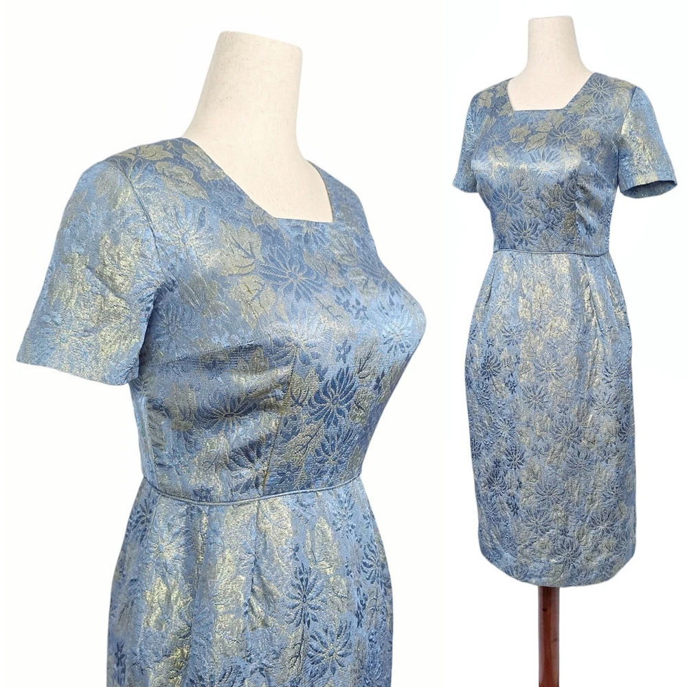 ✦FOR SALE: 1950s Brocade Cocktail Dress. This stunning slate blue and gold jacquard 50s vintage hourglass wiggle dress features a square neckline with a darted bust, short sleeves, and a cinched waist that leads into a straight skirt. The material is very shimmery and catches the light beautifully. I believe it's a silk blend. Zips up the back with a metal zipper and fastens with a hook at the waist and neck. The interior skirt is lined. By Lady Petite, Union Made. Fits a modern Small, shown clipped to fit XS mannequin. No stretch! 36-37” Bust, 28” Waist, 39” Hips. • ✿ Measurements lying flat in inches: • •Shoulders: 15 •Bust: 18-18.5 •Waist: 14 •Hips: 19 •Length: 41 •Sleeves: 7.5