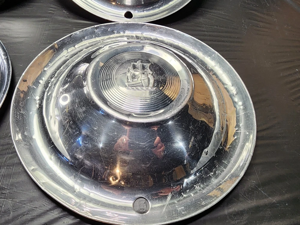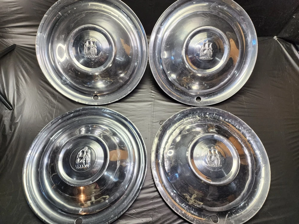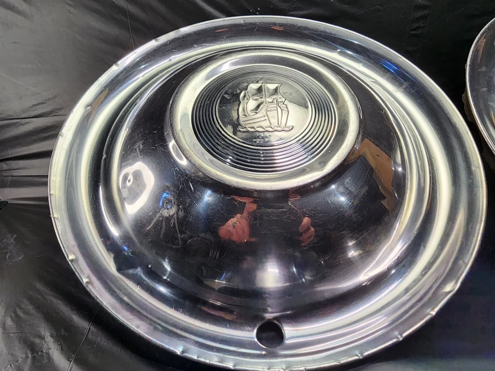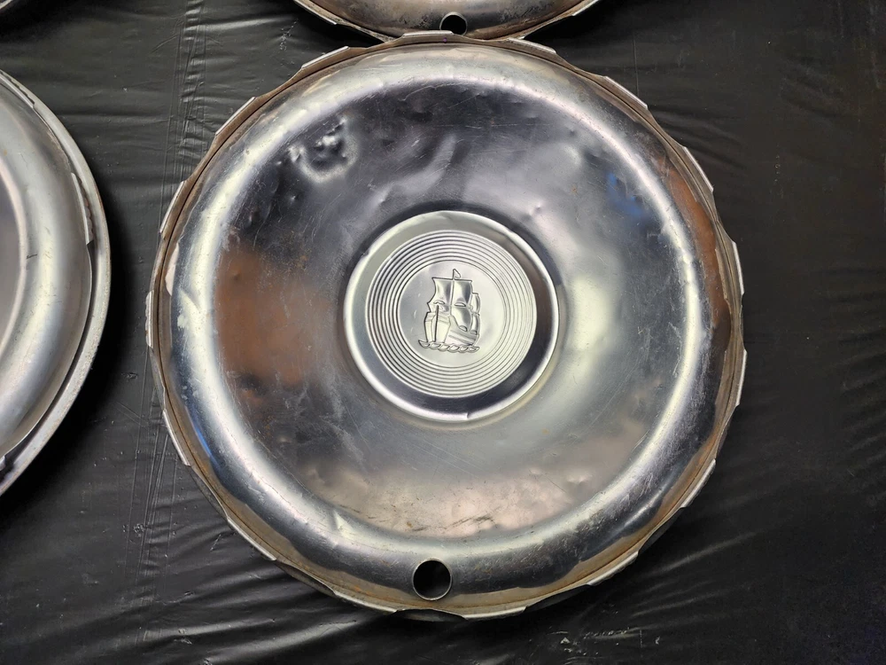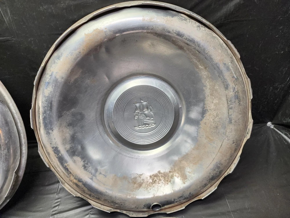 Vintage 50s 60s 70s hub caps. 1951 Plymouth Mopar set of 4 Original OEM OE hubcaps. not in the best of shape, pretty roughed up from decades of use and being on the road. would be decent for a ratrod or wall hangers. These are Used hubcaps off of old classic cars that were driven on the roadand used, so please see photos for complete condition as they are not all perfect. Most have some fading, dings, scuffing, mineral staining, etc could use a good polishing to bring em back to full shine, but otherwise in beautiful condition. Check out more of my ebay page as we are going through and listing a ton of classic / vintage hubcaps from the the 20's 30's 40's 50's 60's 70's 80's 90's 00's and up. all different makes and models such as Ford Chevy Chevrolet GM Cadillac GMC camero nova Chevelle Nomad Bel Air Mercury Corvette Mustang Oldsmobile Pontiac Lincoln Dodge Plymouth Buick Chrysler Mopar Fairlane Volkswagen Cheiftain Challanger Charger 1500 4x4 muscle car hot rod rat rod Cars and Trucks 15in 14in 16in and so much more from full sets to sets of 2 and singles, you name it check us out!