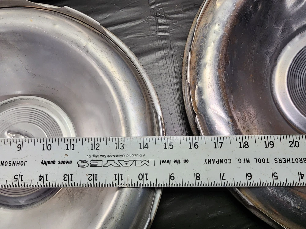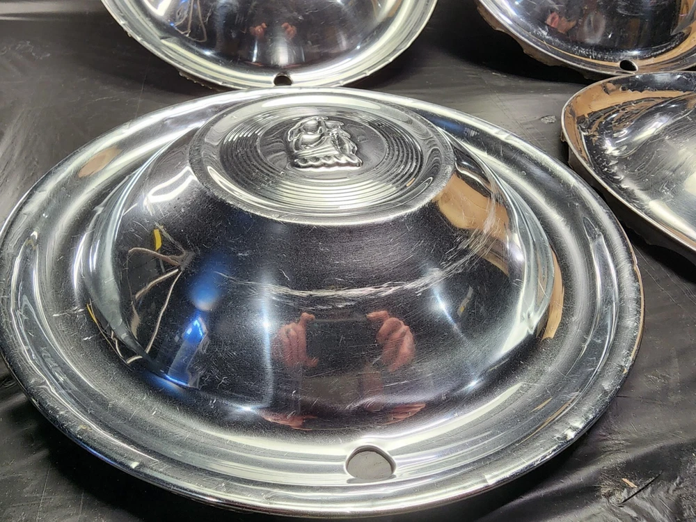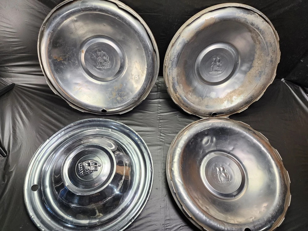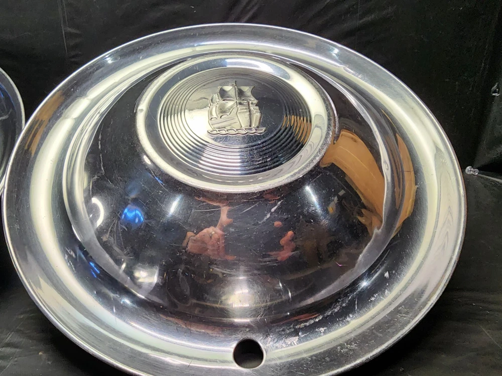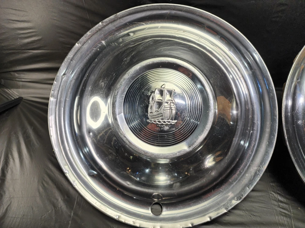 Vintage 50s 60s 70s hub caps. 1951 Plymouth Mopar set of 4 Original OEM OE hubcaps. not in the best of shape, pretty roughed up from decades of use and being on the road. would be decent for a ratrod or wall hangers. These are Used hubcaps off of old classic cars that were driven on the roadand used, so please see photos for complete condition as they are not all perfect. Most have some fading, dings, scuffing, mineral staining, etc could use a good polishing to bring em back to full shine, but otherwise in beautiful condition. Check out more of my ebay page as we are going through and listing a ton of classic / vintage hubcaps from the the 20's 30's 40's 50's 60's 70's 80's 90's 00's and up. all different makes and models such as Ford Chevy Chevrolet GM Cadillac GMC camero nova Chevelle Nomad Bel Air Mercury Corvette Mustang Oldsmobile Pontiac Lincoln Dodge Plymouth Buick Chrysler Mopar Fairlane Volkswagen Cheiftain Challanger Charger 1500 4x4 muscle car hot rod rat rod Cars and Trucks 15in 14in 16in and so much more from full sets to sets of 2 and singles, you name it check us out!