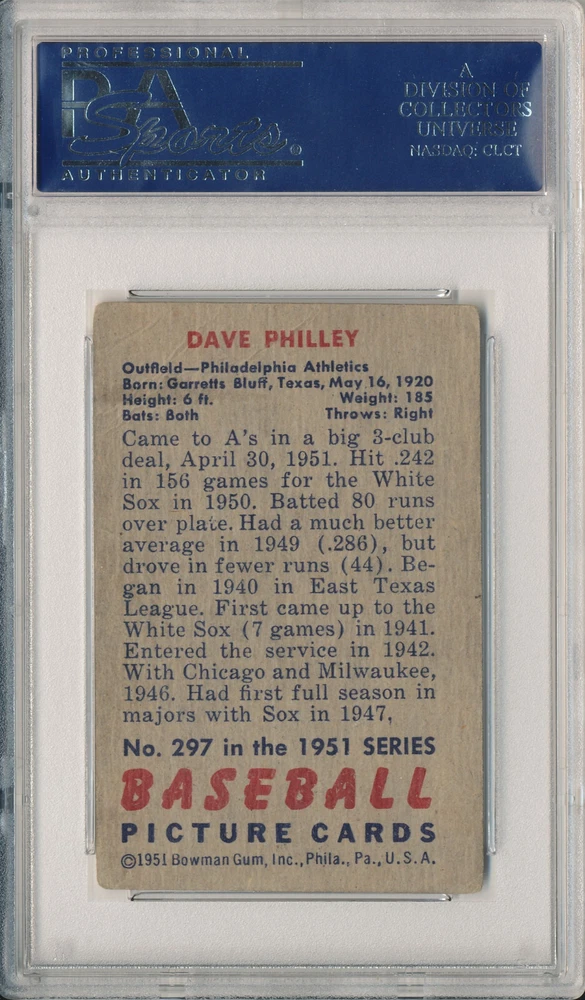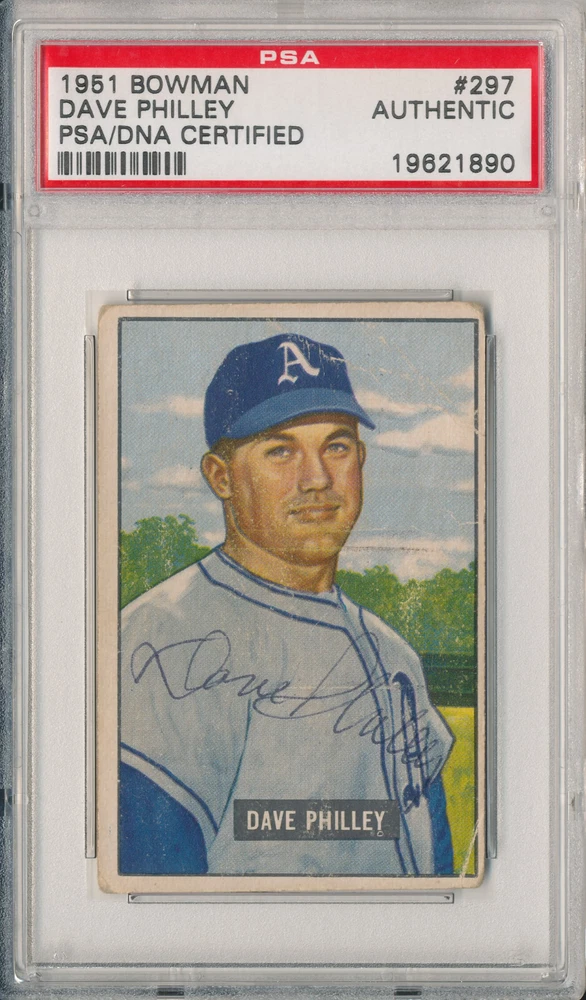 Authenticator Pre-Certified Authenticator: PSA/DNA Item's unique digital ID: 19621890 History of item: Dave Philley Signed original 1951 Bowman card encapsulated by PSA/DNA. Describe how you came to possess this item: Purchased in large collection. This listing is for the rare 1951 Bowman Dave Philley (d.2012) autographed card #297 authenticated and encapsulated by PSA /DNA pictured above. The short printed high number series card itself is in decent condition with a crease at the top and bottom right corners, and it features a nice vintage ballpoint ink autograph from the Athletics star ! The classic 1 951 Bowman cards are a highly desirable vintage card set, and this one features a great example of the baseball great's signature. This signature is encapsulated by PSA/DNA with authentication #19621890. This may be verified on the PSA website by entering the number from the PSA/DNA authentication to get confirmation of the specific signed item. This card has been encapsulated using PSA's more expensive red flip service which not only authenticates the signature, but also authenticates that this indeed is a vintage, not a counterfeit or reprint, 1951 Bowman card which has not been trimmed or altered. Domestic shipping will be free. International bidders please email us for a shipping quote. We do accept eBay payments. If you are an international bidder, we may require that you pay for Global Priority Mail so a tracking number may be provided for your item. Please take a look at our other items available for sale. If you have any questions at all, please do not hesitate to ask them.