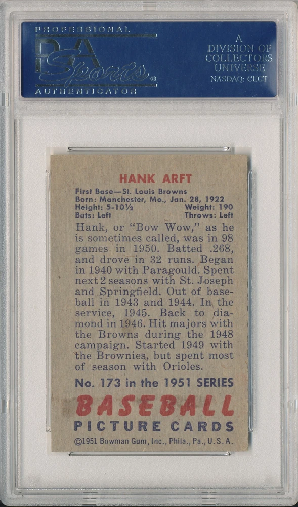 Authenticator Pre-Certified Authenticator: PSA/DNA Item's unique digital ID: 17645038 History of item: Hank Arft Signed original 1951 Bowman card encapsulated by PSA/DNA. Describe how you came to possess this item: Purchased in large collection. This listing is for the rare 1951 Bowman Hank Arft (d.2002) autographed card #173 authenticated and encapsulated by PSA /DNA pictured above. The card itself is in decent condition and it features a nice vintage ballpoint ink autograph from the Browns star ! The classic 1 951 Bowman cards are a highly desirable vintage card set, and this one features a great example of the baseball great's signature. This signature is encapsulated by PSA/DNA with authentication #17645038. This may be verified on the PSA website by entering the number from the PSA/DNA authentication to get confirmation of the specific signed item. This card has been encapsulated using PSA's more expensive red flip service which not only authenticates the signature, but also authenticates that this indeed is a vintage, not a counterfeit or reprint, 1951 Bowman card which has not been trimmed or altered. Domestic shipping will be free. International bidders please email us for a shipping quote. We do accept eBay payments. If you are an international bidder, we may require that you pay for Global Priority Mail so a tracking number may be provided for your item. Please take a look at our other items available for sale. If you have any questions at all, please do not hesitate to ask them.