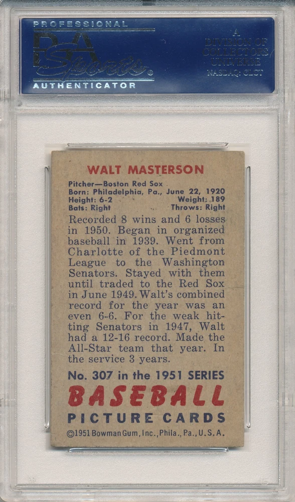 Authenticator Pre-Certified Authenticator: PSA/DNA Item's unique digital ID: 19621891 History of item: Walt Masterson Signed original 1951 Bowman card encapsulated by PSA/DNA. Describe how you came to possess this item: Purchased in large collection. This listing is for the rare 1951 Bowman Walt Masterson (d.2008) autographed card #307 authenticated and encapsulated by PSA /DNA pictured above. The short printed high number series card itself is in decent condition and it features a nice vintage ink autograph from the Red Sox star ! The classic 1 951 Bowman cards are a highly desirable vintage card set, and this one features a great example of the baseball great's signature. This signature is encapsulated by PSA/DNA with authentication #19621891. This may be verified on the PSA website by entering the number from the PSA/DNA authentication to get confirmation of the specific signed item. This card has been encapsulated using PSA's more expensive red flip service which not only authenticates the signature, but also authenticates that this indeed is a vintage, not a counterfeit or reprint, 1951 Bowman card which has not been trimmed or altered. Domestic shipping will be free. International bidders please email us for a shipping quote. We do accept eBay payments. If you are an international bidder, we may require that you pay for Global Priority Mail so a tracking number may be provided for your item. Please take a look at our other items available for sale. If you have any questions at all, please do not hesitate to ask them.
