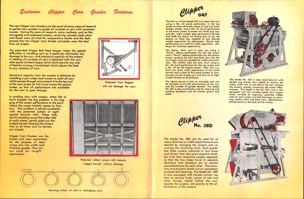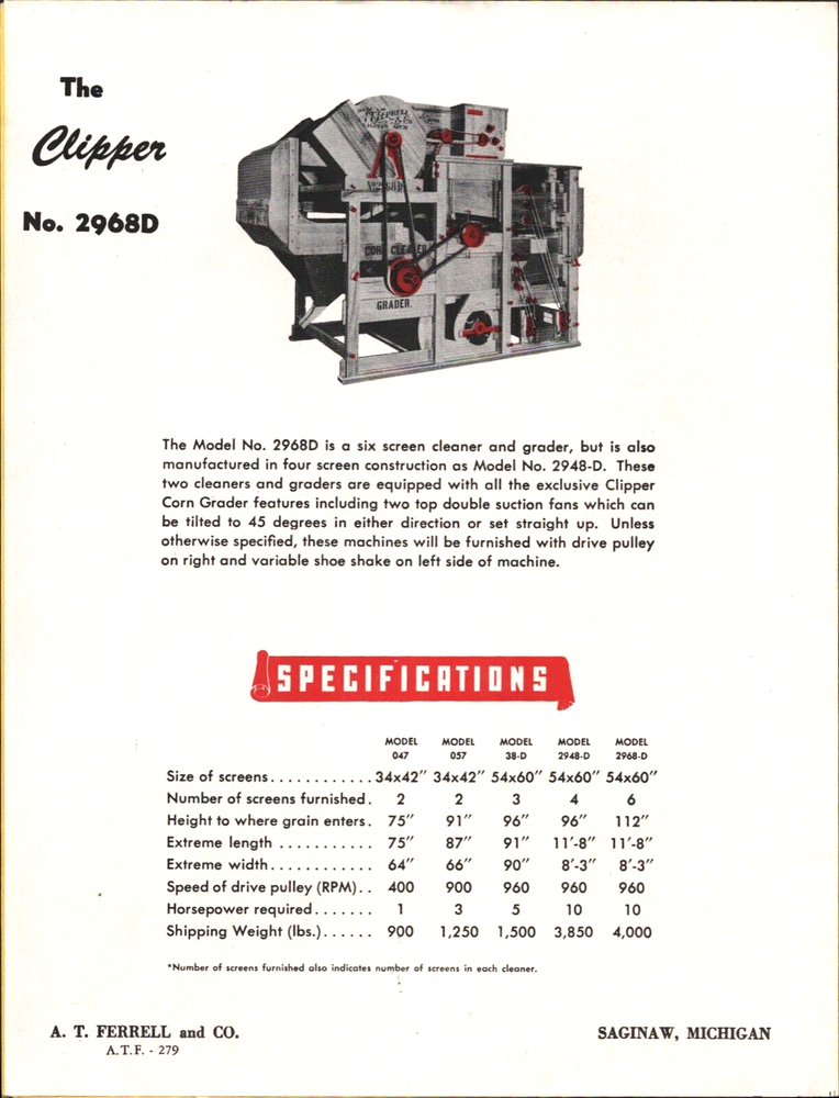 A. T. Ferrell and Co. – Saganaw, Michigan The New Clipper CORN CLEANERS and GRADERS Original vintage advertising brochure 1951 For processing high quality seed of corn hybrids and for market cleaning of grain and seeds Size is 8-1/2" x 11" inches – 4 pages _____________________________ Please wait for combined invoice before paying Visit our store for 2,000+ items – Thank You!