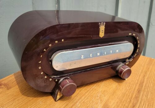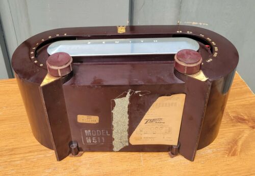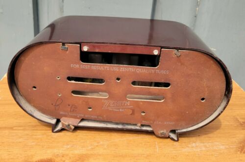 This is an unrestored, as found 1951 Zenith "Racetrack" AM Radio Model H511. The cabinet is in good condition with no breaks or cracks, just very dirty. This is a highly desirable model with radio collectors. The power cord is missing, so i was unable to test its functionality. It appears to be complete and it has all its vacuum tubes. This radio will be properly packed to protect it from physical damage during shipping. I have NEVER had an issue with physical damage during shipping in all my years of selling fragile antique electronics. Though due to the age of this radio, and the nature of vintage tube radios, I cannot guarantee that it will arrive functioning in the same manner, as when I shipped it, since vibrations in shipping can affect the electronics. This seldom is the case, but it can happen. Therefore, it is being sold as is, for restoration, repair, or parts, without warranty and returns are not accepted. See my other listings for vintage radios, as I've recently acquired 70+ radios and just do not have the time or room for more radio projects, so I am thinning the herd!