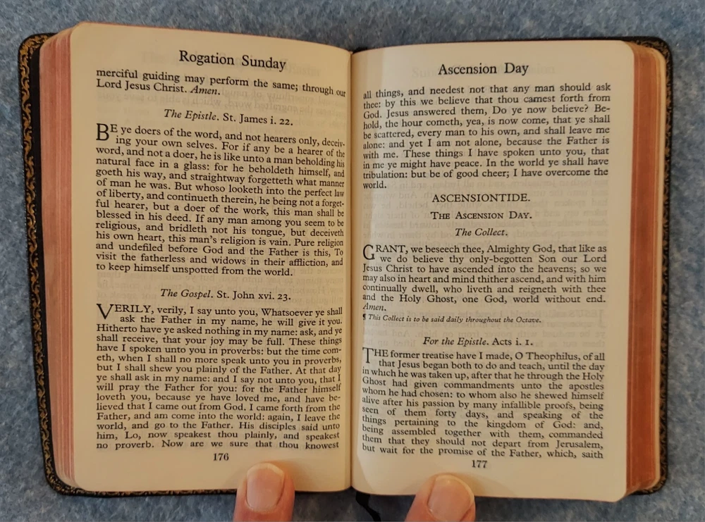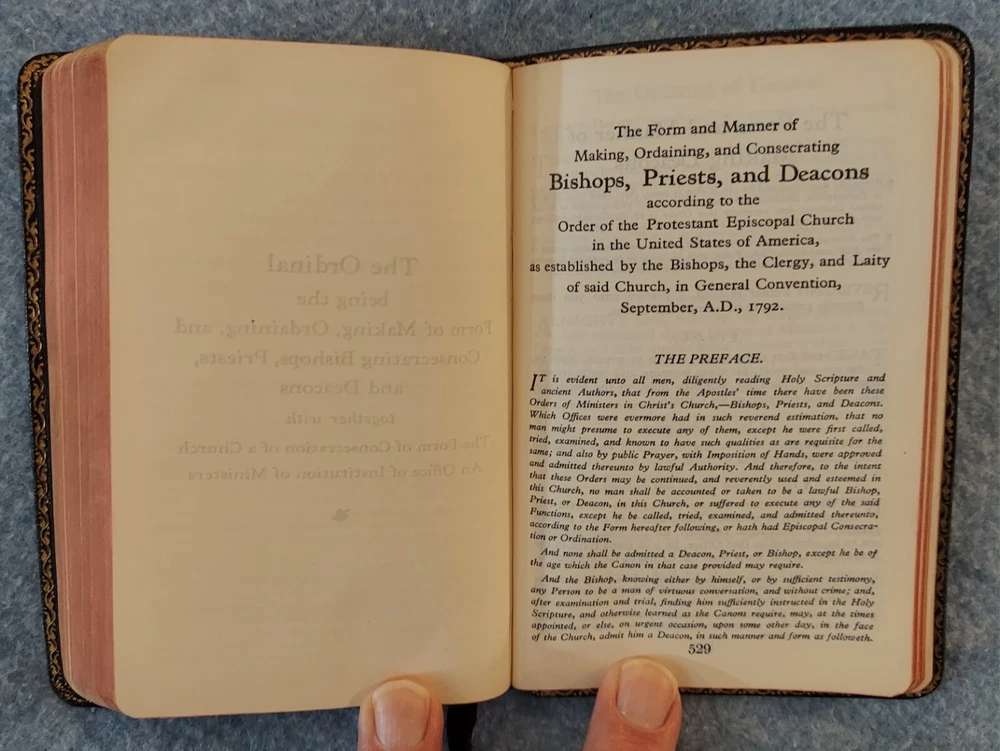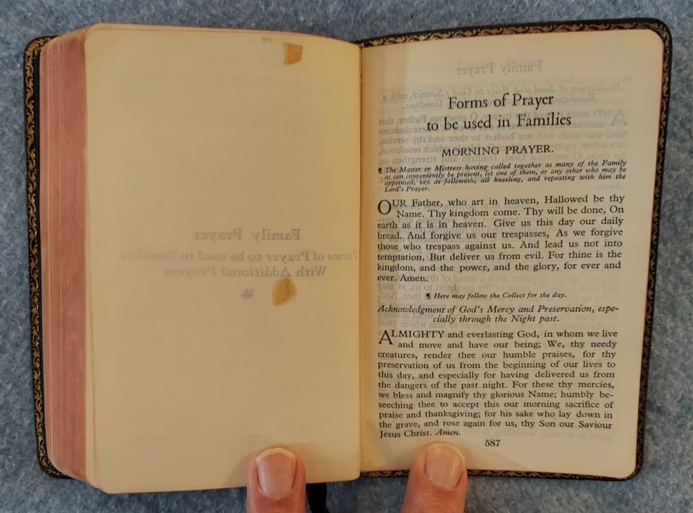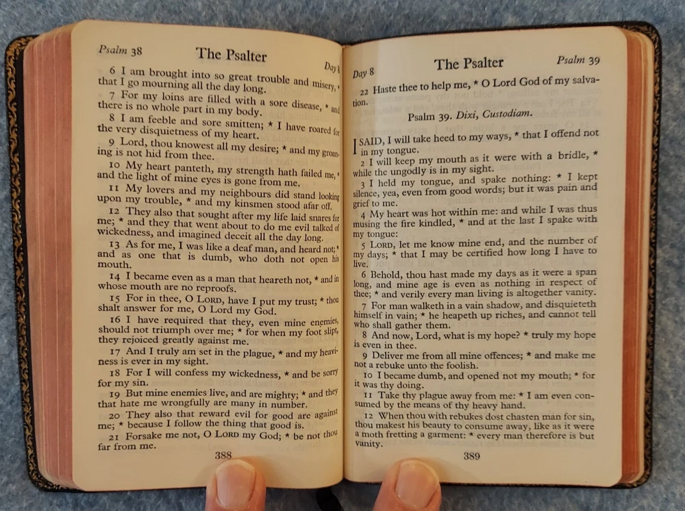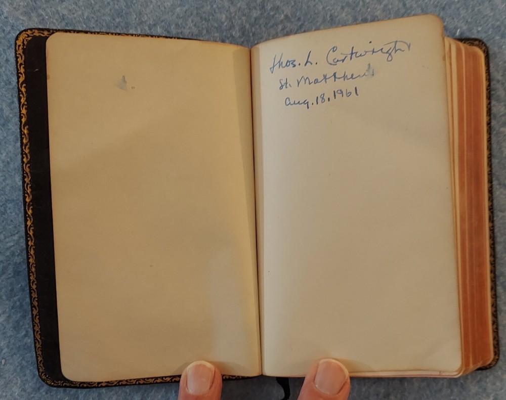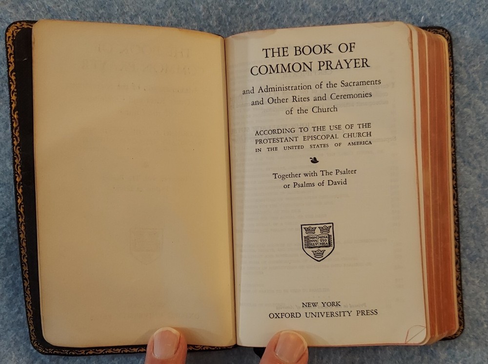 The Book of Common Prayer, Psalter, Episcopal Ch 1952 Oxford U Press Leather? THE BOOK OF COMMON PRAYER and Administration of the Sacraments and Other Rites and Ceremonies of the Church ACCORDING TO THE USE OF THE PROTESTANT EPISCOPAL CHURCH IN THE UNITED STATES OF AMERICA Together with the Psalter or Psalms of David OXFORD UNIVERSITY PRESS Certificate, September 1952 Printed in the United States of America Cover : The cover is believed to be leather but it is not so labeled and I do not claim to be an expert on cover materials. It just looks like leather to me at the small areas of wear. If not leather, the cover is certainly a nice quality vintage imitation leather material. Size : 3 ¾ x 5 ⅞ x ⅝ inches Pages : 611 Publisher code (inside last page) T 2 61 07316 This book is in good condition. The name and church of a previous owner is written on the second page with a date (1961). No other marks are observed. The binding is good. The cover has a bit of light shelf/edge wear. There is a small split at the top/front of the spine. The front cover has been bent and lightly creased at the corners of the front cover and across the top of the back cover. Please see the photos.