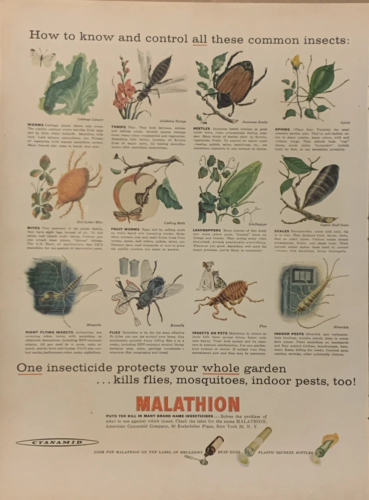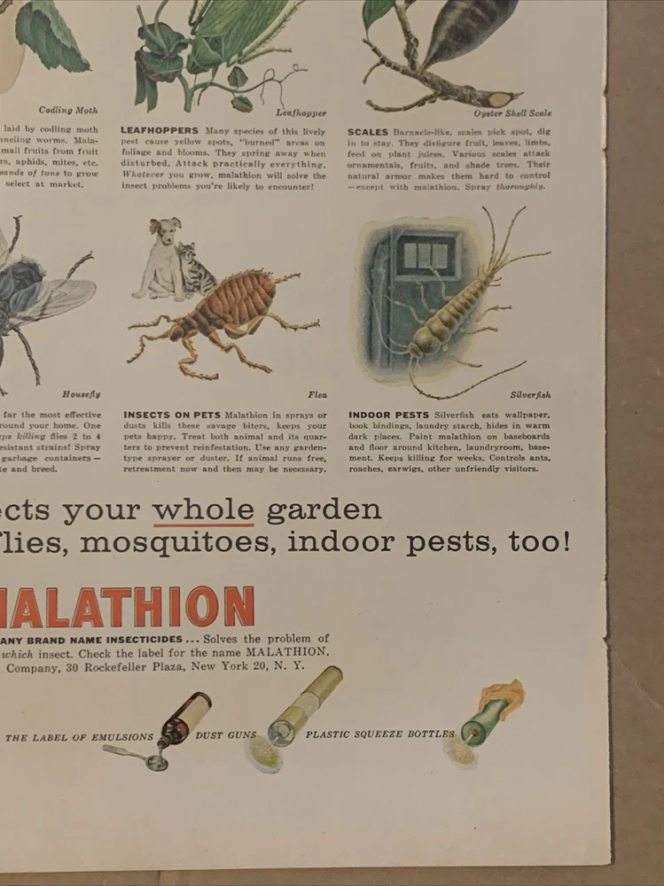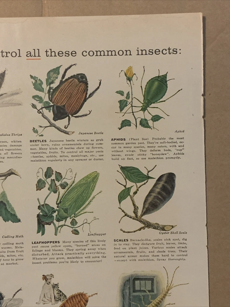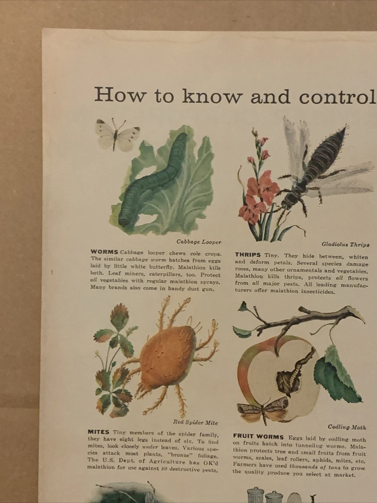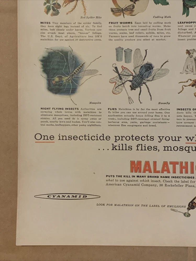 This vintage magazine print ad from the 1950s features American Cyanamid Co.'s Malathion insecticide, perfect for controlling garden pests and common insects. The colorful design and theme of agriculture make it a great addition to any collection of advertising and agriculture memorabilia. The ad is a unique piece of history that showcases the development of pest control in the mid-20th century. Original approximate 10”x13” vintage magazine print ad.