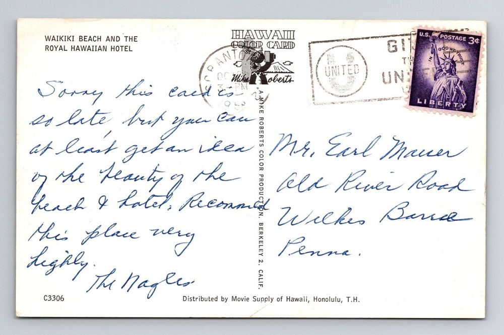 1958 Vintage Waikiki Beach Royal Hawaiian Hotel Hawaii Postcard