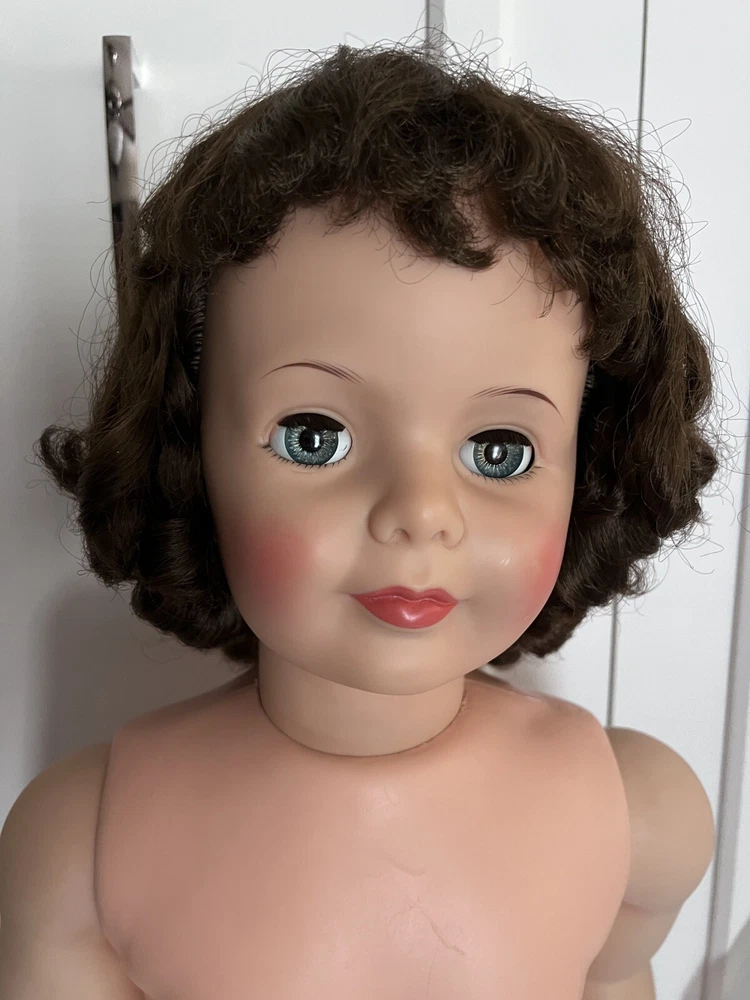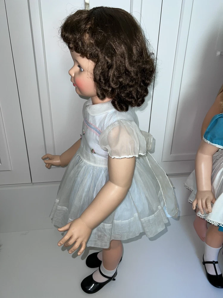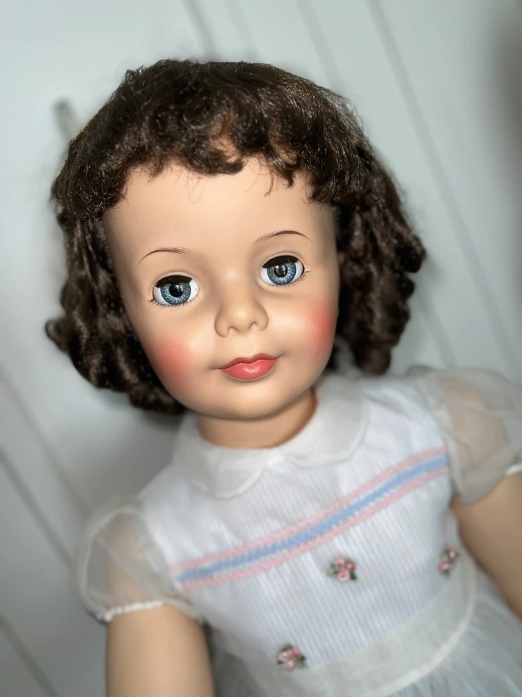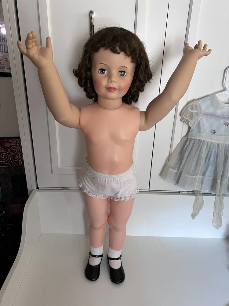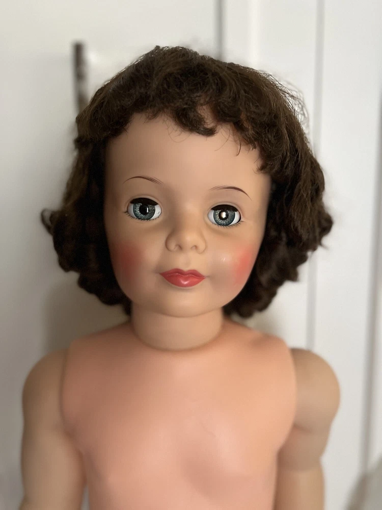 This 1959 Ideal Patti Playpal Doll is a timeless treasure perfect for collectors of all ages. With her beautiful dark brown curly hair, light complexion, and stunning blue eyes, this doll is sure to capture the heart of anyone who sets eyes on her. Measuring at 33 inches in length and size, this doll is made of vinyl, hard plastic, and plastic materials, making her durable and washable. This doll is an original and comes without packaging. She is perfect for all occasions and is sure to make a great addition to any collection. The doll features an open and close mechanism and is a part of the Playpal product line. Don't miss out on the chance to own this rare piece of vintage fashion and beauty.