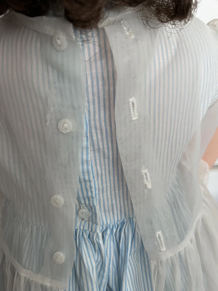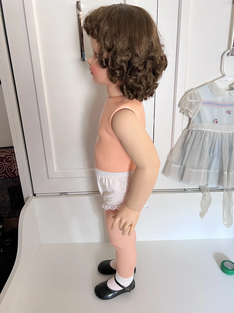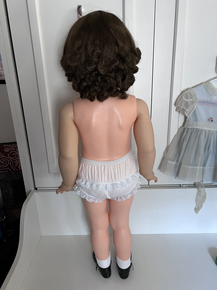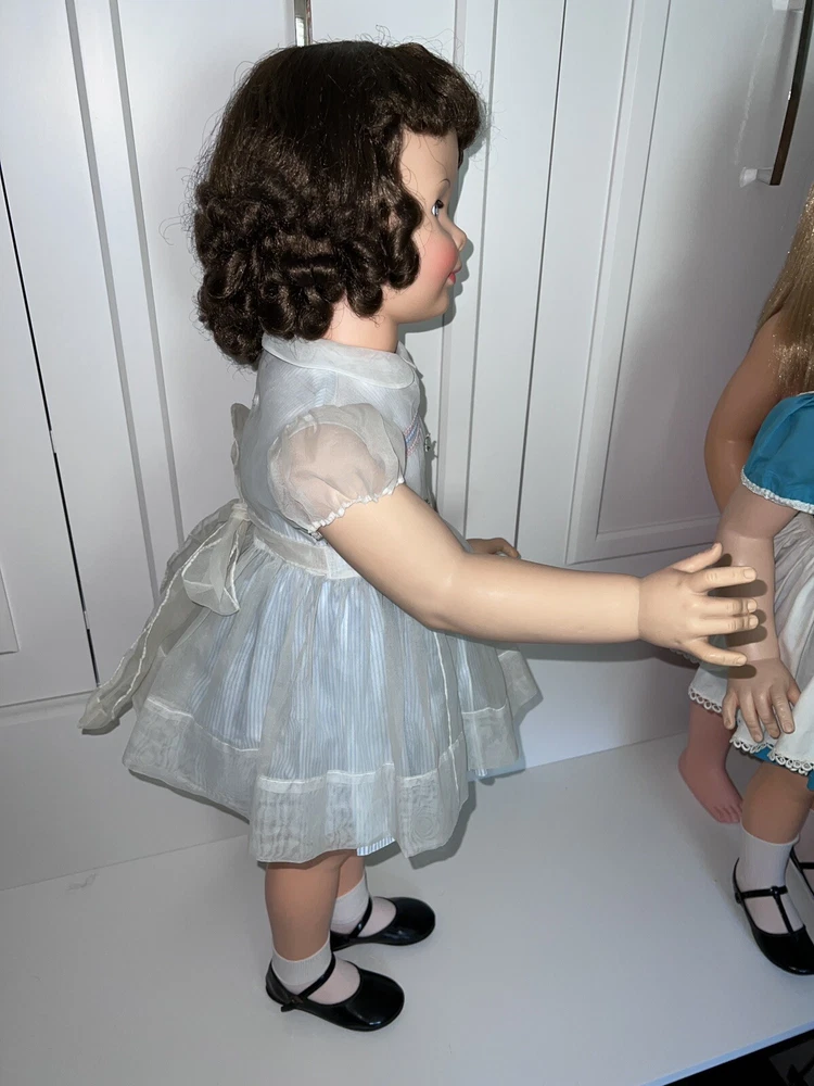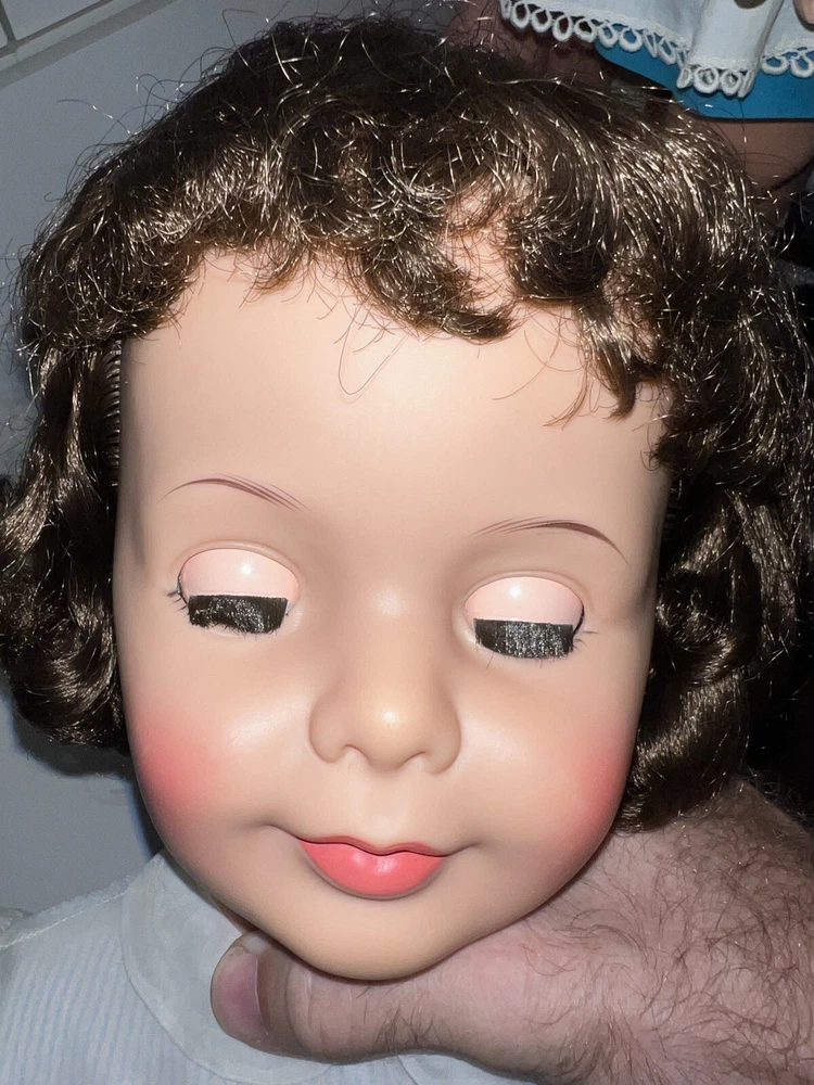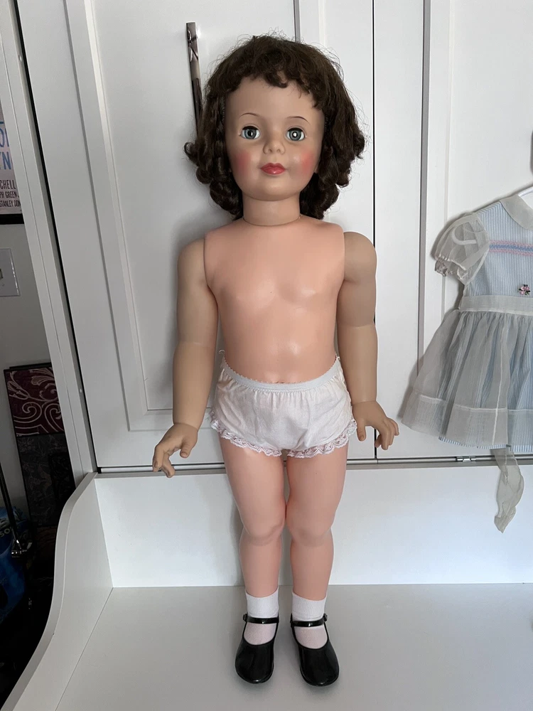 This 1959 Ideal Patti Playpal Doll is a timeless treasure perfect for collectors of all ages. With her beautiful dark brown curly hair, light complexion, and stunning blue eyes, this doll is sure to capture the heart of anyone who sets eyes on her. Measuring at 33 inches in length and size, this doll is made of vinyl, hard plastic, and plastic materials, making her durable and washable. This doll is an original and comes without packaging. She is perfect for all occasions and is sure to make a great addition to any collection. The doll features an open and close mechanism and is a part of the Playpal product line. Don't miss out on the chance to own this rare piece of vintage fashion and beauty.