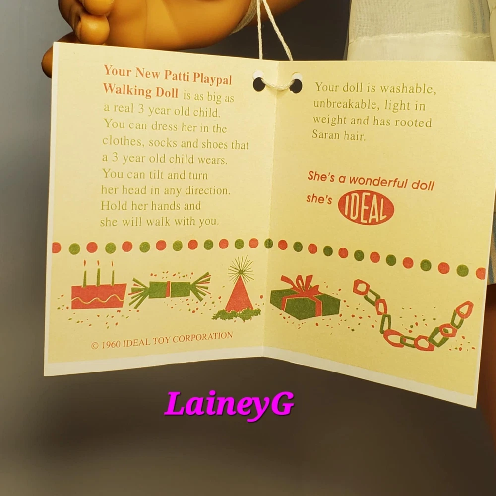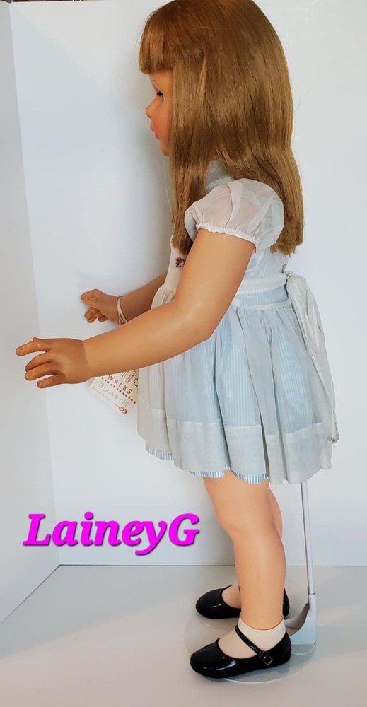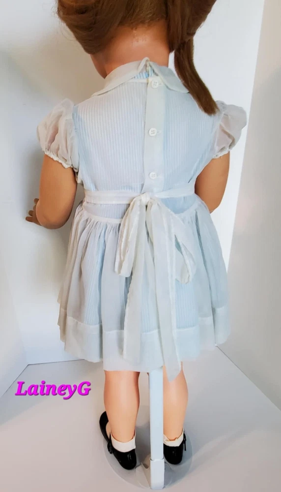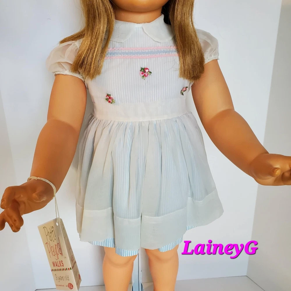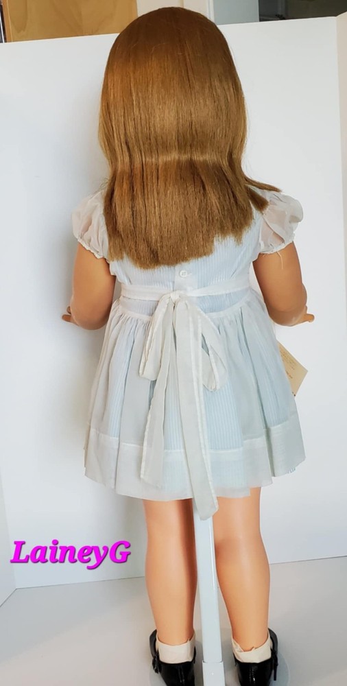 1959 Ideal Patti Play Pal Doll with pinstriped dress, organdy pinafore, panties, socks and shoes. Also has a copy of the original hangtag. She is 35" tall, the size of a three-year-old child. THIS IS NOT AN ASHTON DRAKE REPRODUCTION, THIS IS AN ORIGINAL FROM 1959. This doll would be stunning in your collection! I bought the doll in 1998 and she has been stored in a pet-free, smoke-free home. I have included photos from different angles to give you a better idea of condition. I have never undressed the doll, but have no reason to believe her torso or covered extremities are damaged. I will not undress the doll, as her outfit and shoes could become damaged due to its age. Her strawberry reddish-blond hair is soft and I don't see any missing plus or evidence of a haircut. Her green eyes open and close easily and do not appear cloudy. She has all of her eyelashes and her face paint looks really good for her age and the assumption that she was played with at one time before becoming a collectible. Her pinafore has a few small holes, but does not take away from the overall beauty of this doll. She is marked Ideal 1959 on her neck. Her head is not as tight as it could be, but as you can see from the photos she holds her head up independently. I believe the dress, pinafore and shoes are original, not sure about panties and socks. At one time, I had a massive doll collection, but have sold most of my other dolls. The dolls I have left will be listed and sold on Ebay as well. I want her to go to a home with a new owner who will love and enjoy her as much as I have. Please do not ask me to contact you outside of Ebay. I accept PayPal ONLY. Paypal is only accepted from a confirmed PayPal address. Purchases must be paid for within 3 days of close. Shipping costs are not negotiable. I do not ship overseas, or to Post Office Boxes or APO/FPO addresses. I ONLY ship to the buyer's confirmed Paypal address. NO exceptions. I ship within 3 business days of receiving payment. Items are USED unless otherwise noted in auction. All items are sold "AS IS" and are final. I do my best to accurately describe each item, including any flaws. It is the responsibility of the bidder/buyer to carefully study the pictures. The description is an extension of the photographs. Item is non-returnable. Contact me through Ebay if you have questions before you bid/buy. By bidding/buying, you acknowledge that you have no questions needing to be answered or clarified. Please do not bid/buy if you do not agree with any statement in this auction. If you fail to pay within 10 business days, then this auction is canceled by mutual agreement; the auction will be revoked and a non-paying bidder alert will be filed. Thank you and please check out my other auctions!