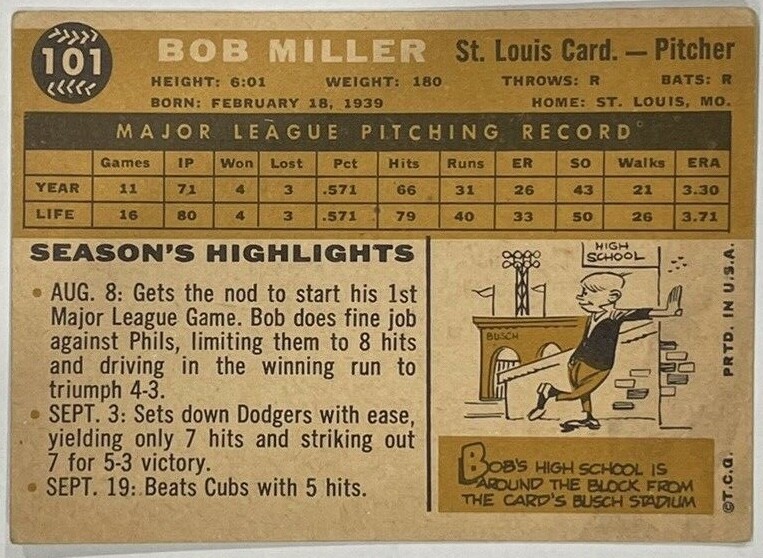 1960 Topps Bob Miller #101 MLB Baseball Card St Louis Cardinals Vintage Card is in good condition! Actual card shown in the photos. Card Number: #101 Ships within 1 business day of payment being received! Ships via eBay Standard Envelope Checkout my other items for sale for other sports cards, memorabilia, clothing, and much much more!! Don't hesitate to ask any questions!!