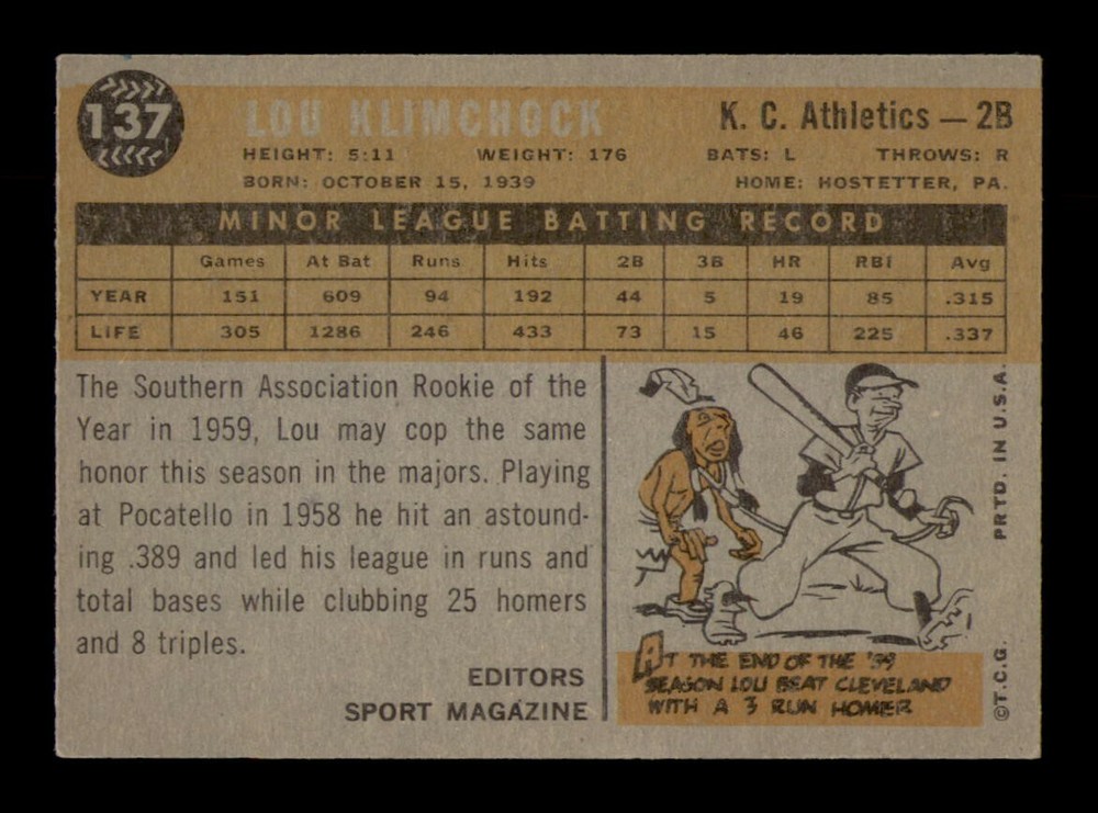 Player: Lou Klimchock Original/Reprint: Original Card Manufacturer: Topps Graded: No Year: 1960 Series: Varies Sport: Baseball Season: 1960