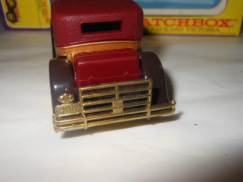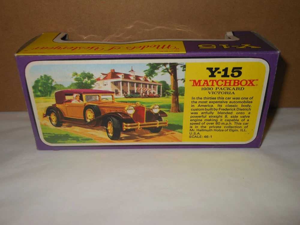 MATCHBOX MODELS OF YESTERYEAR 1930 Packard Victoria Y-15 (purple box) CIRA: 1969-1977 COLOUR: Gold Condition : Model Excellent. with minor wear as seen in photo With a good original box. With all end flaps attached. Knocks and wear to the corners of the box and fading as seen in photo. Please view the pictures for more details Combine postage welcome