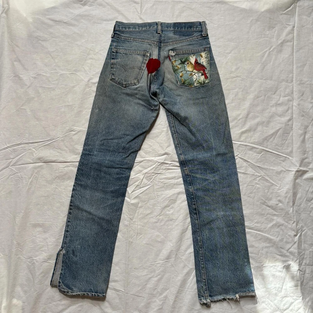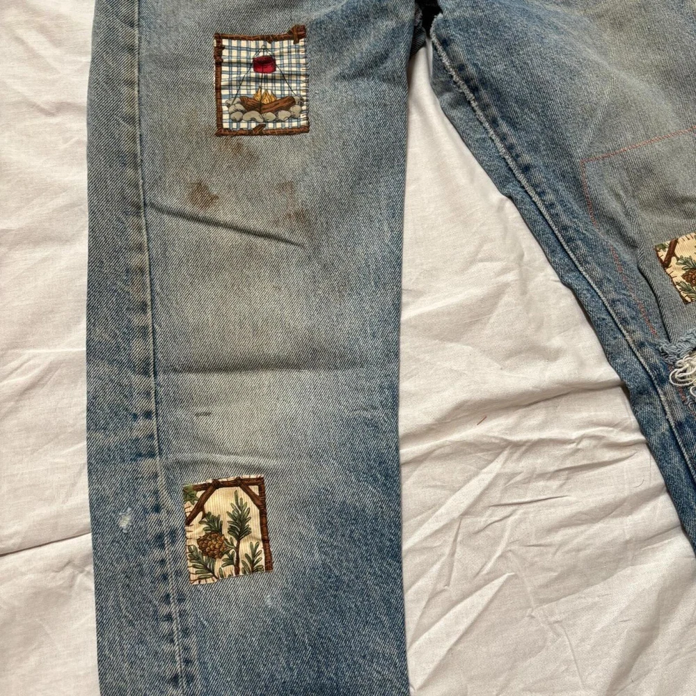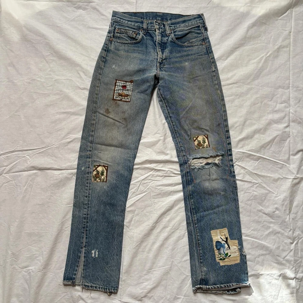 1960s-70s faded, distressed and patched up Levi's jeans Tags and back patch missing, looks like 505 style zipper fly straight leg Amazing fades and distressing, original patchwork job Measures 28x31, bundle for free shipping