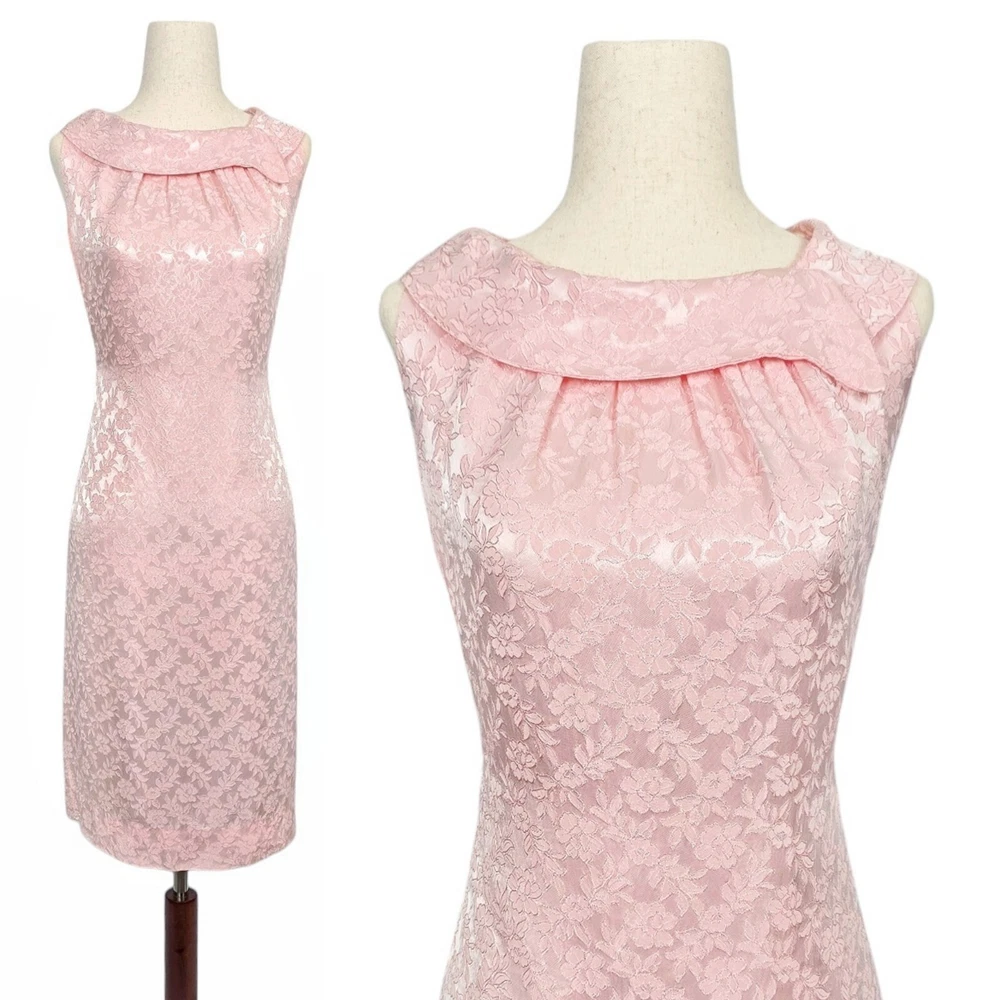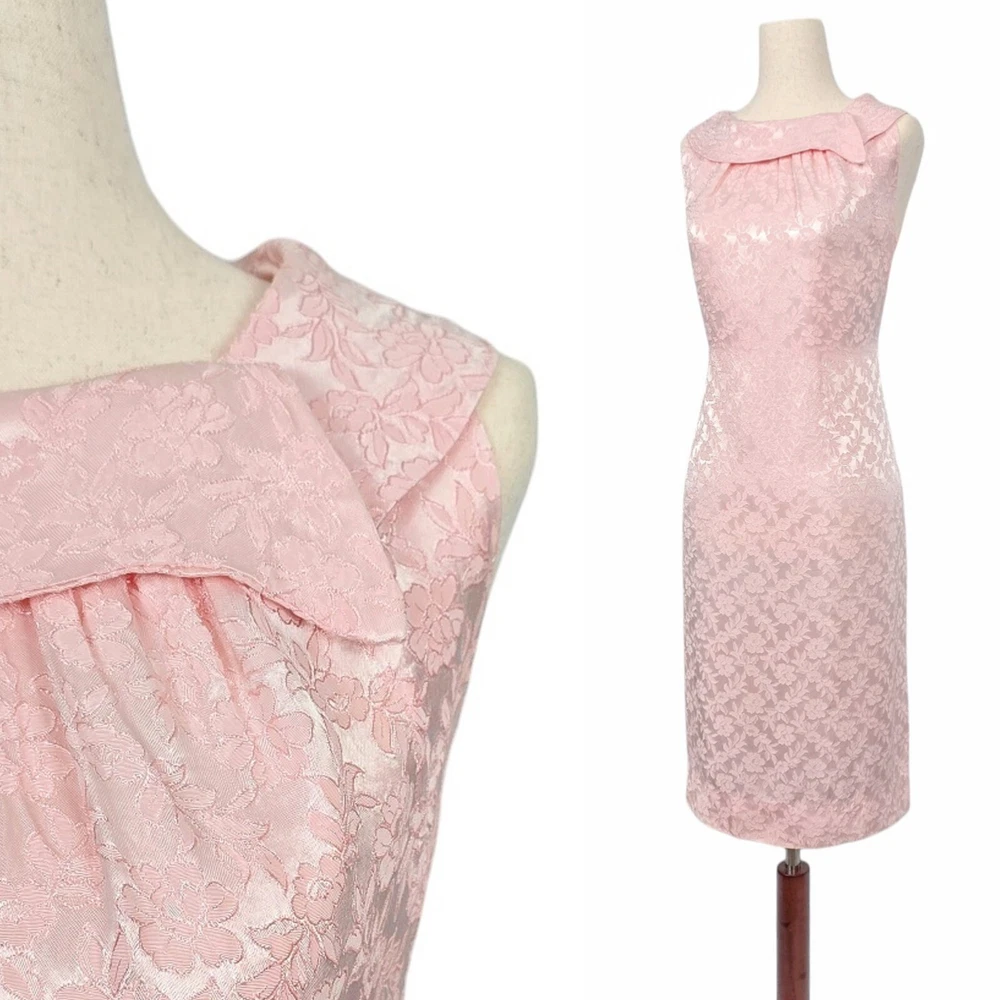 ✦FOR SALE: 1960s Brocade Dress. This delicate pink 60s vintage dress features a gorgeous atomic era space age wing tip collar & a beautiful, intricate threaded flower pattern. The dress has a lovely illustrious sheen. Zips up the back. Shift shape, shown clipped to fit XS mannequin - swipe to see unclipped. No tags/labels or stretch. Fits a Small / Medium. 36-37" Bust, 34" Waist, 38" Hips. • ✿ Measurements lying flat in inches: • •Shoulders: 12 •Bust: 18-18.5 •Waist: 17 •Hips: 19 •Length: 37
