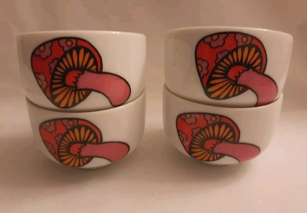 Add some retro charm to your dining table with this set of four vintage serving bowls. The porcelain bowls feature a colorful orange and white mushroom design, perfect for a mid-century modern themed dinner party. Each bowl is round in shape and 2.25 in height making them ideal for serving. The set includes four bowls and is manufactured in 1960 using the pottery production technique. The brand is Serving Bowls Mushroom and the style is art pottery. Perfect for collectors or those who appreciate unique and vintage pieces.