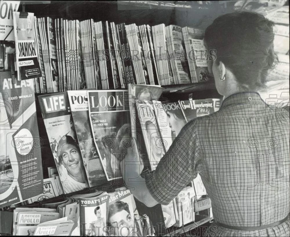 1961 Press Photo Woman checks magazine on a rack at a New York magazine stand