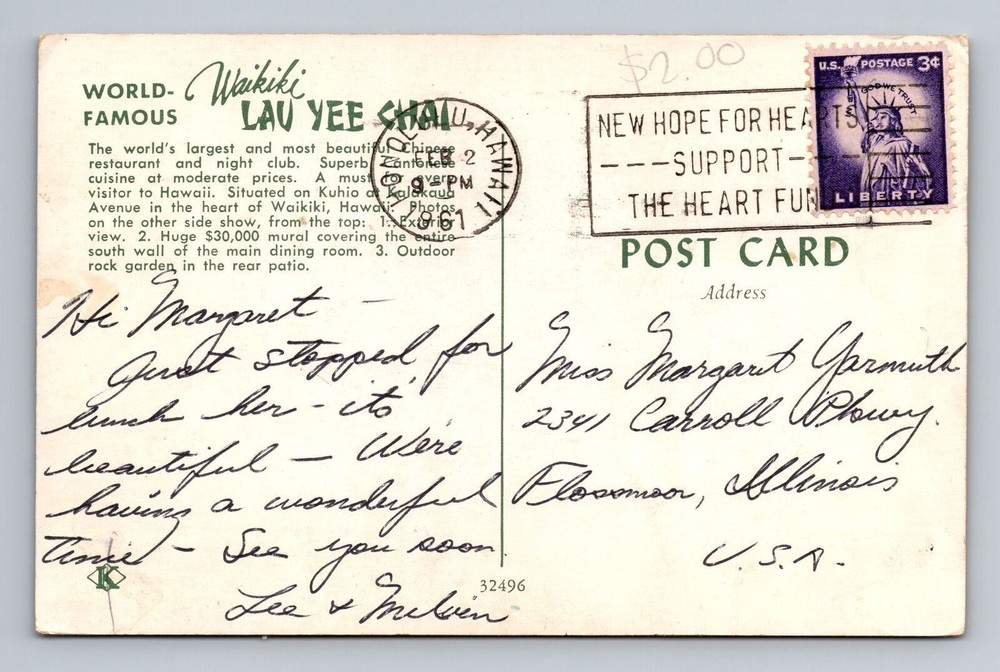 1961 Vintage Postcard of Lau Yee Chai Chinese Restaurant in Waikiki, Hawaii