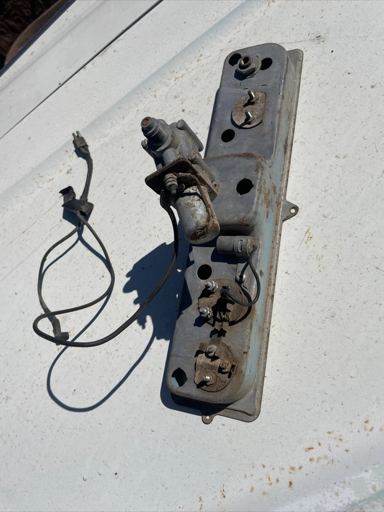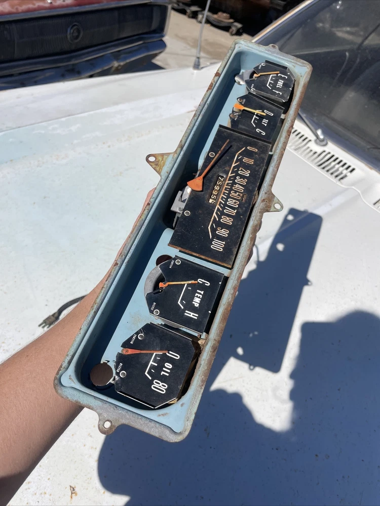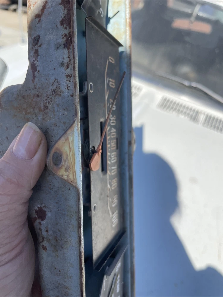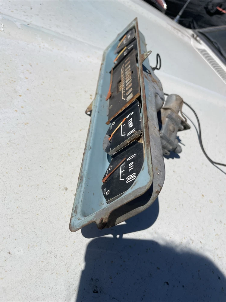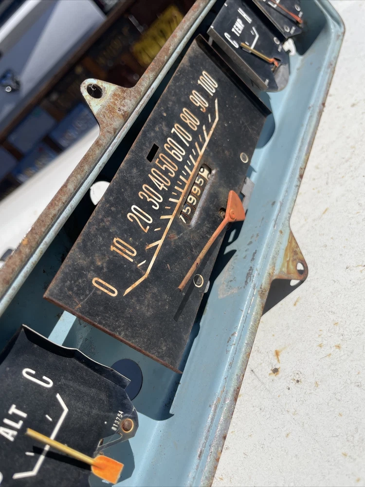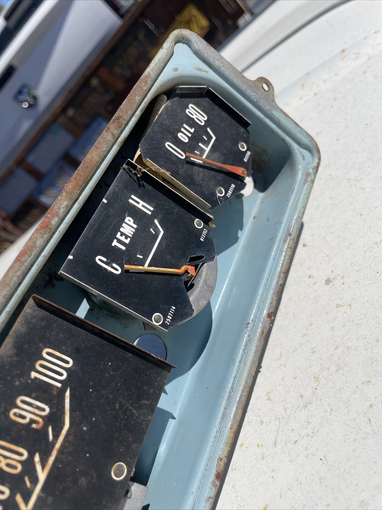 1960s Dodge gauge cluster assembly for parts. Came off a 67 D300 with the speedometer 2 speed axel corrector. “Removable for smaller trucks” All gauges are there, however they do have some rust and damage to them. Housing is straight but also has surface rust. Good for parts! Assume nothing works! Sold as is, thank you! “Description edit” Just put a battery to the gauges, Fuel did not work, Alt worked, Speedo is untested “assume not working because of the damage”, temp worked but the needle also jumps, oil gauge is untested needs a line hooked up to it.