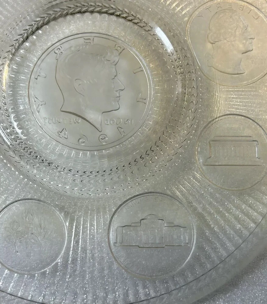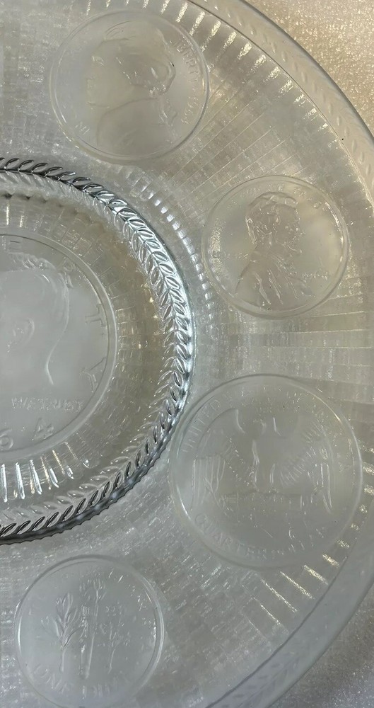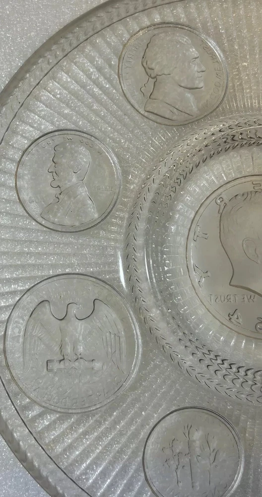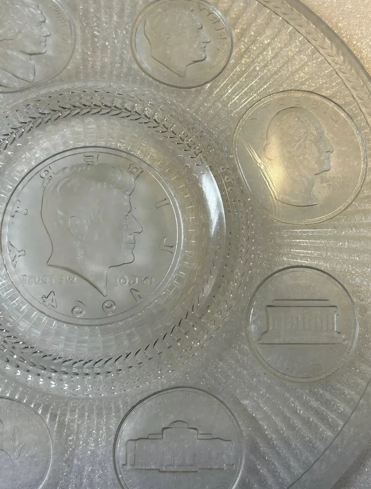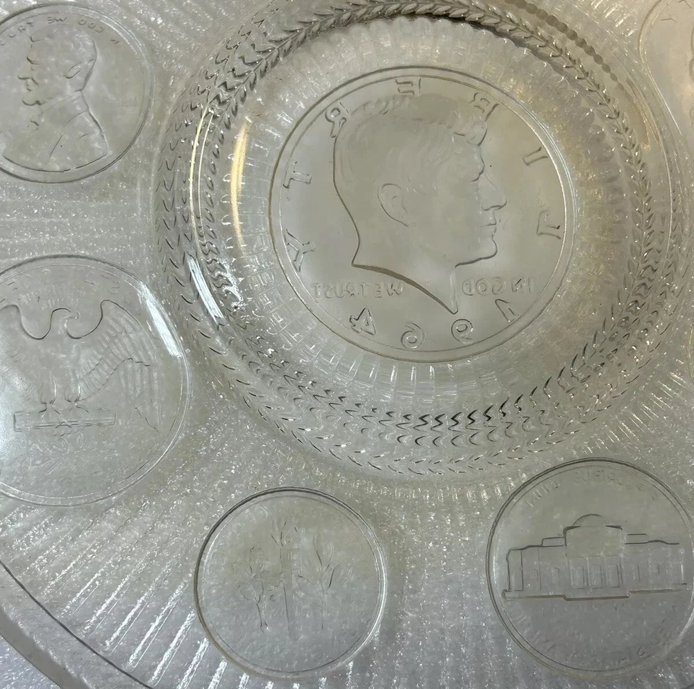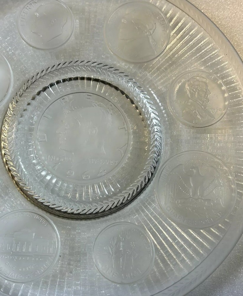 1964 Crystal Coins Imperial Clear Glass Collector Plate Silver USA Vintage This beautiful handcrafted vintage crystal collector plate from Imperial Glass features a stunning design of all the US coins released in 1964, the last year that silver was used in US coinage. It is in wonderful condition, with no chips or cracks. Please see photos for details. Measurements are approximate. Smoke free home. I use recycled materials in shipping whenever possible and advisable. Please let me know if you have any questions.
